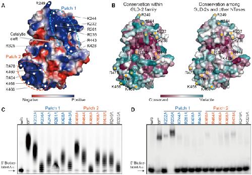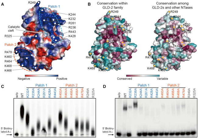 Figure 7. Analysis of positively charged surface residues of rnGLD-2. (A) The electrostatic surface potential of rnGLD-2. Some positively charged residues are specified. Two positively charged patches and the catalytic cleft are indicated. (B) The surface conservation plots of rnGLD-2 within the GLD-2 family (left) and among other NTases including MTPAP, Cid1, TUT4 and TUT7 (right). (C) PAP activity of rnGLD-2 with mutations of positively charged surface residues as in A. (D) EMSA results showing the substrate affinity of rnGLD-2 with mutations of positively charged surface residues as in A.