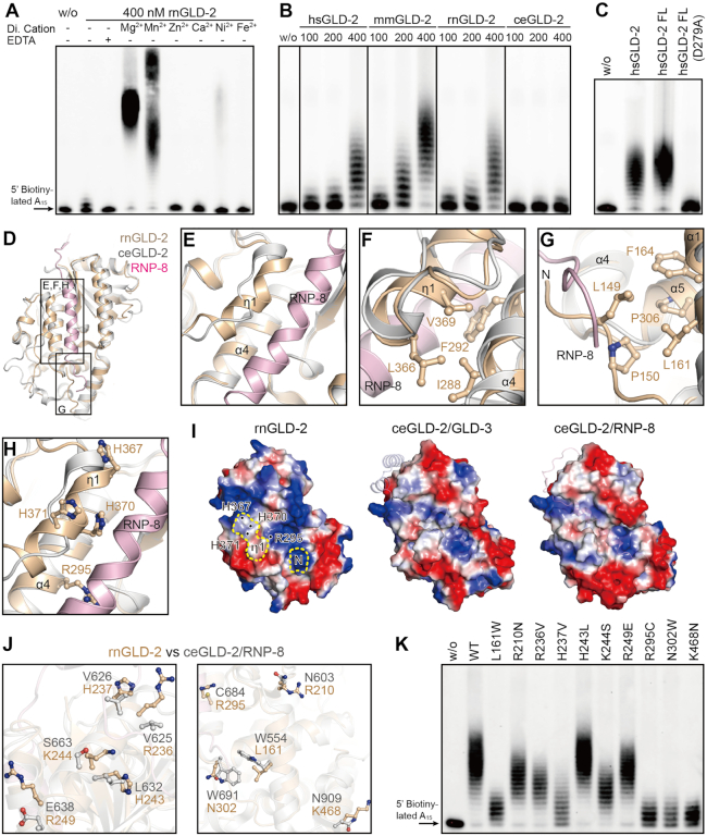 Figure 3. rnGLD-2 is a potent PAP. (A) The PAP activity of rnGLD-2 in the presence of various divalent cations. A total of 400 nM rnGLD-2 was incubated with 500 nM 5â² biotinylated A15 RNA oligo and 500 μM ATP. For each sample, 2 mM indicated divalent ion or EDTA was supplied to the reaction. w/o, without protein. (B) Protein concentration-dependent PAP activity of hsGLD-2, mmGLD-2, rnGLD-2 and ceGLD-2. (C) Comparison between truncated and full-length hsGLD-2 in PAP activity. (D) Overall structural comparison between rnGLD-2 and ceGLD-2/RNP-8 complex from the backside of the catalytic domain, where the interaction site of ceGLD-2 and RNP-8 can be seen. Frames indicate the areas shown in panels (EâH). (EâH) Detailed structure differences between rnGLD-2 and ceGLD-2 explaining the discrepancy of their PAP activity. Color as in D. (E) The unique 310 helix (η1) of rnGLD-2 and its relative position to RNP-8. (F) Interaction between η1 and α4 buries the local hydrophobic cluster of rnGLD-2. (G) The N-terminal tip of rnGLD-2 shelters the hydrophobic residues on α1 and α5. (H) The histidine cluster on η1 and non-conserved Arg295 of rnGLD-2. (I) Electrostatic surface potential comparison at the backside of catalytic center for rnGLD-2 (left) and ceGLD-2 complexed with GLD-3 (middle) or RNP-8 (right). Locations of the N-terminal tip (N) and 310 helix (η1) of rnGLD-2 are outlined by yellow dashes, and the histidine cluster and Arg295 are indicated. GLD-3 and RNP-8 are shown in cartoon representation with 50% transparency. (J) Non-conserved surface residues between rnGLD-2 and ceGLD-2 that may affect substrate binding. (K) PAP activity of rnGLD-2 with mutations regarding the residue difference from ceGLD-2 as shown in (J).