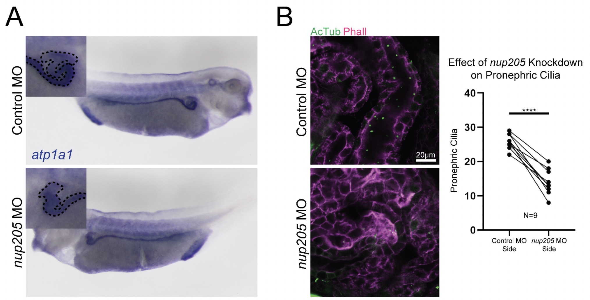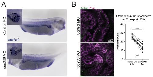 Fig. S2. Pronephric Development and Ciliation is Dysregulated by Knockdown of nup205. (A) WISH for expression of atp1a1 as a marker of pronephric development in control and nup205 morphant sides of embryos. (B) Proximalpronephroscilia in control and nup205 morphant sides of embryos along with quantitation. Indicate number of embryos in which proximal pronephric cross-sections were assessed on both control MO injected and nup205 MO injected sides. p<0.0001 for **** by paired T-Test.