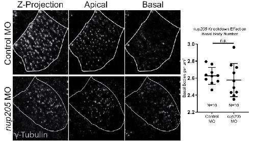Fig. S4. Knockdown of nup205 Disrupts Basal Body Distribution within MCCs. Representative images and quantitation of basal body number for control and nup205 morphant embryo MCCs. Ns indicate number of individual MCCs assessed across a minimum of 3 replicates with one MCC assessed per individual embryo. n.s. â not significant by two-tailed T-Test.