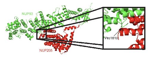 Fig. S5. NUP205 Variant May Weaken Protein-Protein Interactions. The published structure of the NPC was used to determine the location of amino acid residue changes resulting from variants in an individual with heterotaxy. Left: The 3D structure of NUP93 and NUP205 (pdb: 5IJO): NUP93 (green) and NUP205 (red). Inset on right: The 3D structure of an interface region between NUP93 and NUP205.