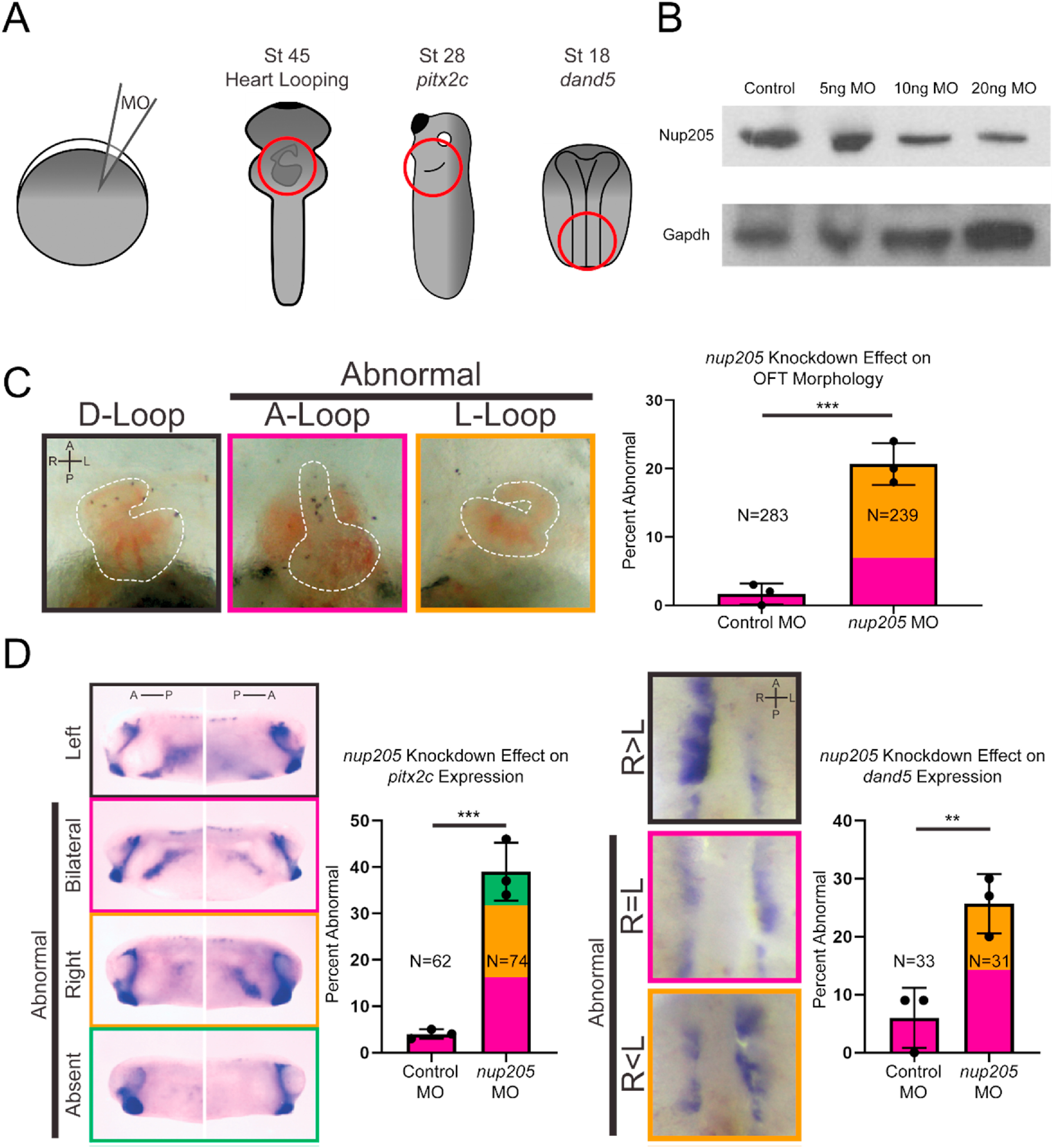 Fig. 1. Knockdown of nup205 Disrupts LR Patterning. (A) Schematic of one-cell injections and regions analyzed for LR patterning defects. (B) Representative blot of Nup205 protein levels in whole stage 45 Xenopus protein extracts. (C) Representative images of normal and abnormal cardiac OFT directionality (ventral views with anterior to the top) along with quantitation of frequency of abnormal morphology in control and nup205 morphant embryos. (D) Representative images of normal and abnormal pitx2c expression patterns (lateral views, dorsal to the top) along with quantitation of frequency of abnormal patterns in control and nup205 morphant embryos. (E) Representative images of normal and abnormal dand5 expression patterns (ventral views, anterior to the top) along with quantitation of frequency of abnormal patterns in control and nup205 morphant embryos. For all graphs, Ns indicate number of individual embryos assessed across a minimum of 3 replicates. Graph colors correspond to example border colors. Bar graph color coding depicts proportion of total MCCs assessed, while error bar is based on frequency of combined abnormal phenotypes. p < 0.005 and p < 0.0005 for ** and *** respectively by two-tailed T-Test. A â anterior, P â posterior, R â right, L-left. (For interpretation of the references to color in this figure legend, the reader is referred to the Web version of this article.)