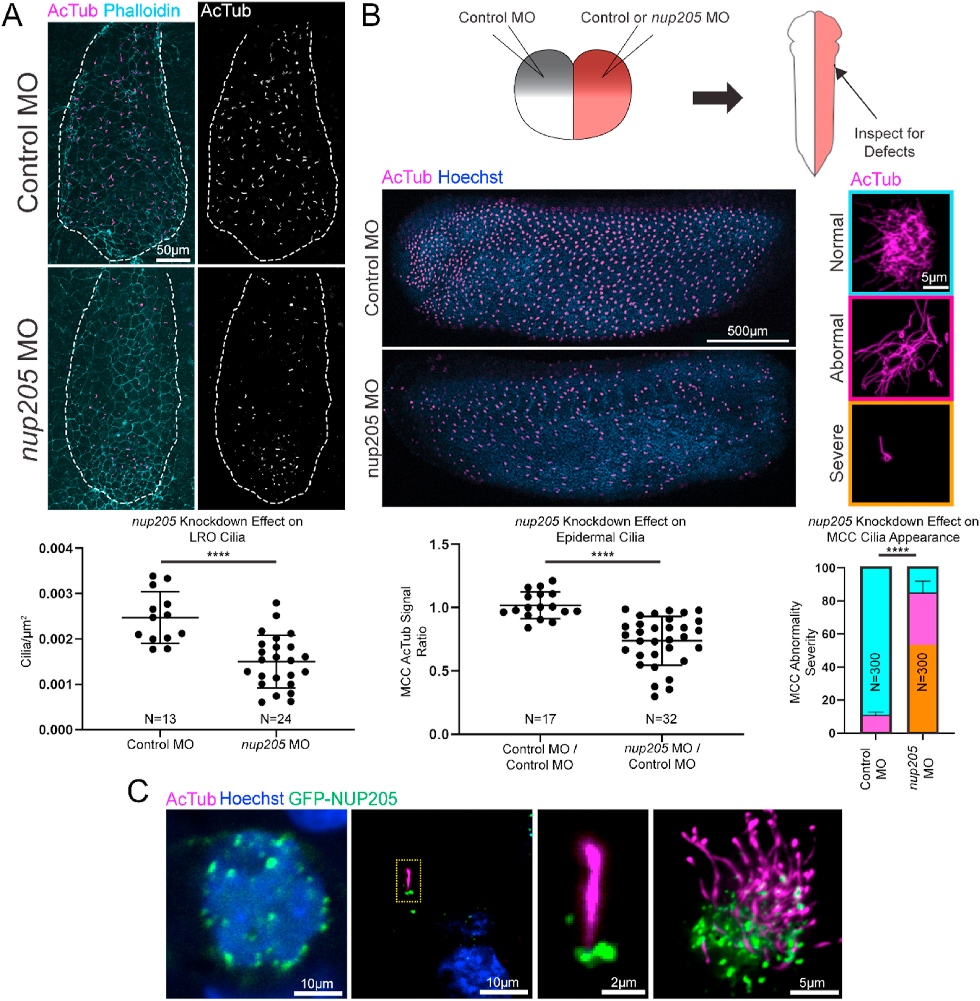 Fig. 2. Knockdown of nup205 Disrupts Cilia in Multiple Tissues. (A) Representative images and quantitation of cilia number for control and nup205 morphant embryo LROs (ventral view with anterior to the top). Ns indicate number of distinct LROs analyzed. (B) Schematic of two-cell injections and representative images of control and nup205 morphant sides of an embryo (lateral view with dorsal to the top, top panel left side, bottom panel right side) and severity of ciliation defects in individual MCCs along with quantitation of remaining multiciliated structures and severity of MCC defect frequency. Ns indicate number of distinct embryos for which both sides were analyzed (dot plot) and numer of MCCs analyzed on either control MO or nup205 MO injected sides of embryos with no more than 10â¯MCCs assessed per a single side of an embryo (bar graph). Graph colors correspond to example border colors. Bar graph color coding depicts proportion of total MCCs assessed, while error bar is based on frequency of combined severe and abnormal phenotypes. (C) Representative localization of overexpressed GFP-NUP205 at the nuclear periphery and cilium in the Xenopus LRO and MCCs (yellow dotted line designates magnified area). p < 0.0001 for **** by two-tailed T-Test for dot plots or Chi Squared Test for bar graph. Graphed values were obtained across three replicates. (For interpretation of the references to color in this figure legend, the reader is referred to the Web version of this article.)