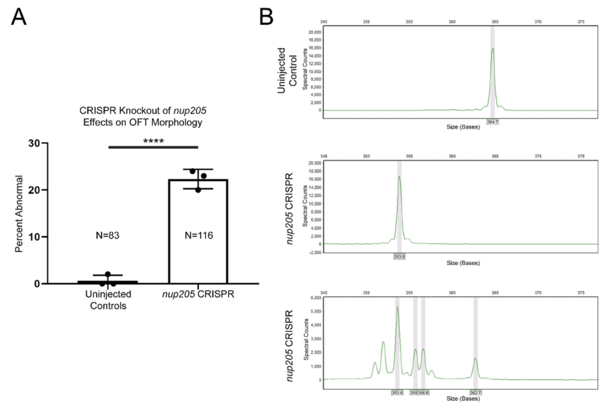 Fig. S1. F0 CRISPR Knockout of nup205 Disrupts LR Patterning. (A) Quantitation of abnormal cardiac OFT morphology frequency in control and nup205 morphant embryos. (B) Fragment analysis of one control embryo and two crispant embryos shows the various edits achieved in F0 embryotissue (expected size: 365). Ns indicate number of individual embryos assessed across 3 replicates. p<0.0001 for **** by two-tailed T-Test.