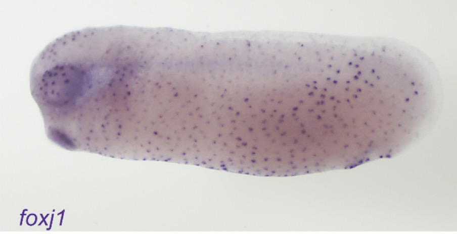 foxj1 (forkhead box J1) gene expression in X.tropicalis embryo, assayed via in situ hybridization, NF stage 28, lateral view, anteriorleft, dorsal up.