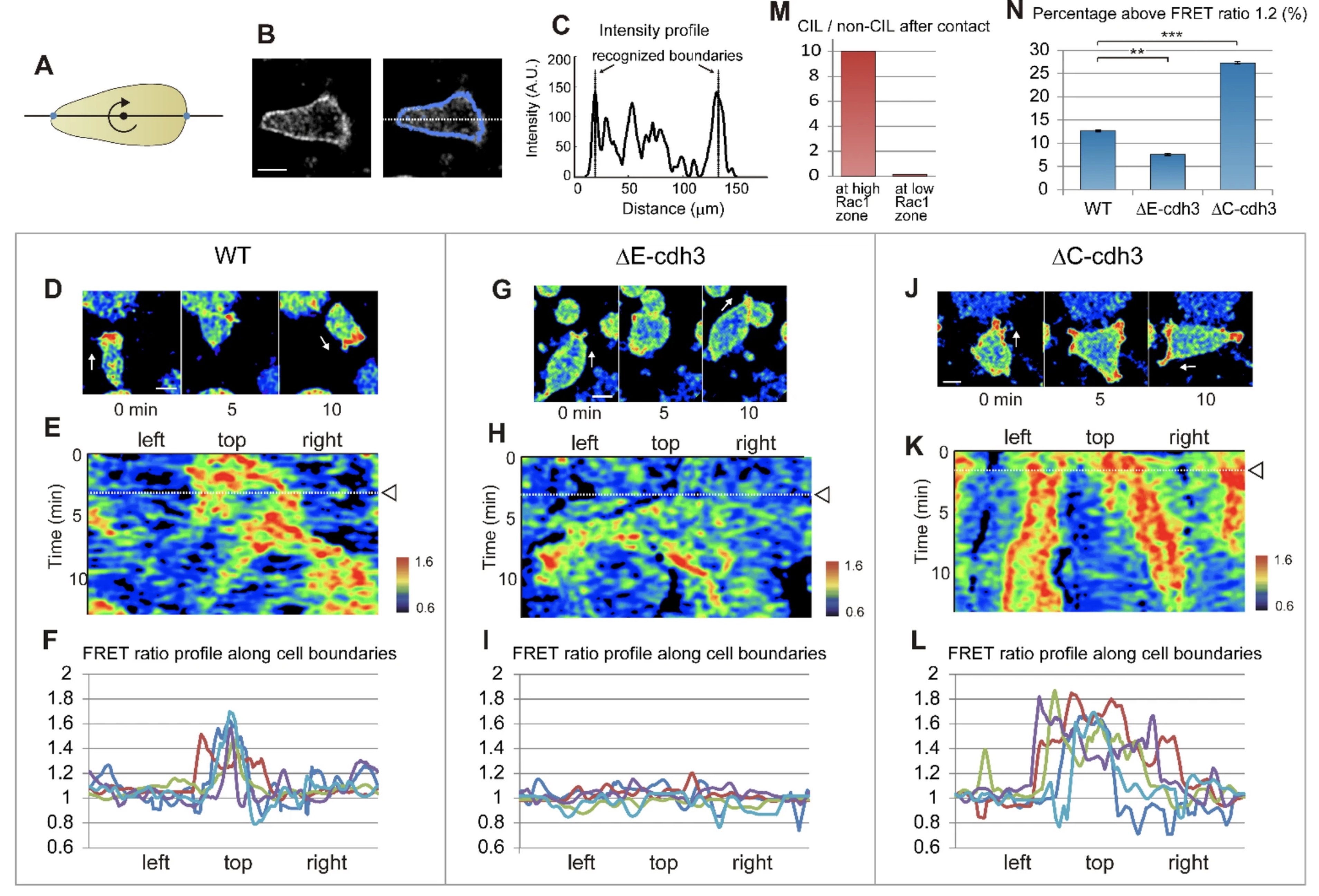 Figure 4. Truncated cadherins alter the spatial patterns of Rac1 activity during cellâcell collisions. (A) Schematic of the method for segmenting the cell membrane of migrating cells. The line passing through the center of the cell detects peaks on both sides in the YFP channel and rotates 360° by 1°. (B) Representative Rac1 biosensor FRET image (CFP channel, left) and segmented points for activity quantification (blue line, right). (C) The intensity profile of Rac1 activity along the white dotted line (B; cell boundary indicated). (D) Representative FRET images before, during, and after a typical cellâcell collision of single WT cell. Rac1 activity is shown in pseudocolor; white arrows indicate the directions of cell migrations. (E) Kymograph of Rac1 activity along the cell perimeter during a cellâcell collision with cell initially moving to the top of the frame in (D). The center of the x-axis indicates the front of the migrating cell prior to the collision. The arrowhead and dotted line indicate the time of the collision. After the collision, (F) FRET profile along cell perimeters of five typical cells. The center of the x-axis indicates the front of the migrating cell. (G) Time-course images before, during, and after a typical cellâcell collision of single ÎE-cdh3 expressing cell. (H) Kymograph during the cellâcell collision of ÎE-cdh3 expressing cell. (I) FRET ratio profile along cell perimeters of five typical cells. (J) Time-course images before, during, and after a typical cellâcell collision of single ÎC-cdh3 expressing cell. (K) Kymograph during the cellâcell collision of ÎC-cdh3 expressing cell. (L) FRET ratio profile along cell perimeters of five typical cells. (M) The frequency of WT CIL is high when the first contact occurs in a high Rac1 activity zone and low when contact occurs in a low Rac1 activity zone. (Nâ=â77 contacting at high Rac1 zone, 9 contacting at low Rac1 zone). (N) Percentage of cell perimeter above ratio 1.2 along cell boundary in WT, ÎE-cdh3, and ÎC-cdh3 cells. WT: 12.6â±â0.18 (meanâ±âSE)% (Nâ=â57), ÎE-cdh3: 7.6â±â0.22% (Nâ=â50, pâ<â0.01), ÎC-cdh3: 27.3â±â0.26% (Nâ=â59, pâ<â0.001). |