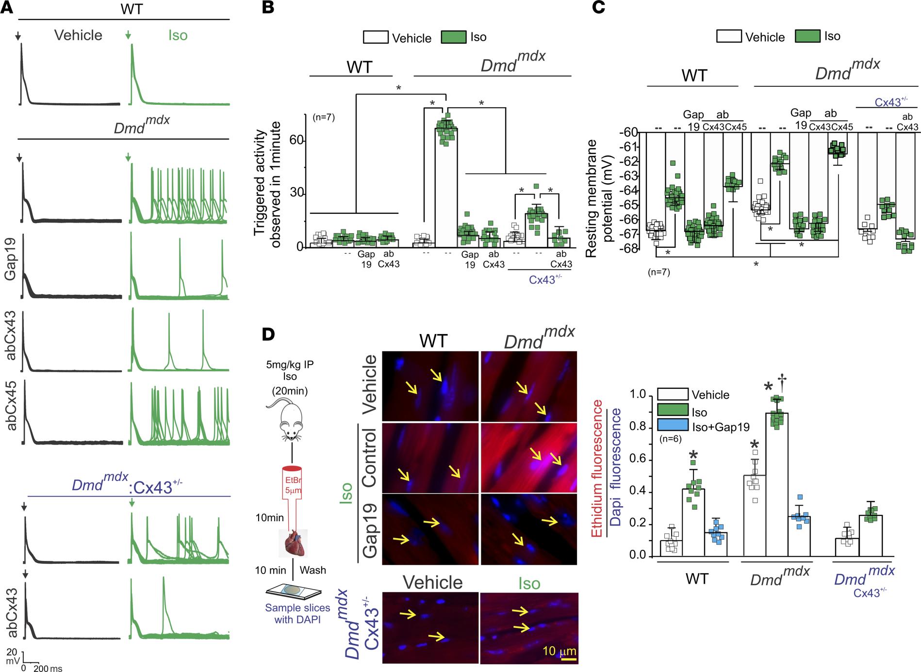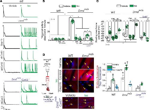 Figure 1 Isoproterenol induces triggered activity in Dmdmdx cardiomyocytes via opening of Cx43 hemichannels. (A) Representative action potential (AP) traces of WT, Dmdmdx, and Dmdmdx Cx43+/– isolated cardiomyocytes. Cells were stimulated with 1 μM isoproterenol (Iso, shown in green) in the absence or presence of Cx43 or Cx45 hemichannel blockers contained inside the pipette: Gap19 (232 ng/μL), Cx43 CT antibody (abCx43; 2.5 ng/μL), or Cx45 CT antibody (2.5 ng/μL). Arrow indicates electrical stimulation pulse. (B) Quantification of triggered activity (TA) induced by Iso observed in A. Comparisons between groups were made using 2-way ANOVA plus Tukey’s post hoc test; *P < 0.05. (C) Resting membrane potential of WT and Dmdmdx cardiomyocytes. The number in parentheses indicates the n value. Comparisons between groups were made using 2-way ANOVA plus Tukey’s post hoc test; *P < 0.05. (D) Assessment of Cx43 hemichannel activity in the whole heart via ethidium uptake. Isolated hearts were perfused with buffer containing 5 μM ethidium after vehicle or Iso (5 mg/kg IP). The number in parentheses indicates the n value. Comparisons between groups were made using 2-way ANOVA plus Tukey’s post hoc test. *P < 0.05 vs. vehicle WT; †P < 0.05 vs. vehicle Dmdmdx. |