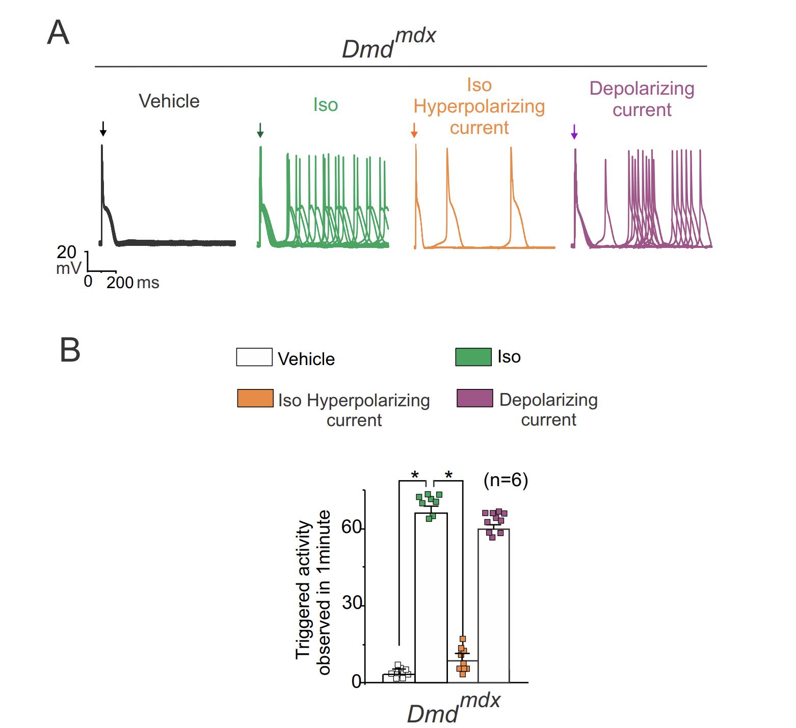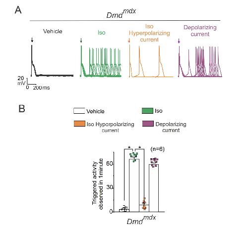 Fig S1. Injection of hyperpolarizing and depolarizing current are sufficient to regulated TA in isolated Dmdmdx cardiomyocytes. A) Representative action potentials traces of Dmdmdx isolated cardiomyocytes in the absence or presence of 1μM isoproterenol (Iso). Hyperpolarizing (20-12 pA) or depolarizing currents (12-8 pA) were injected to maintain the resting membrane potential close to -70 mV (value observed in WT cardiomyocytes) or near - 60 mV (value observed in Dmdmdx cardiomyocytes treated with Iso), respectively. Arrow indicates electrical stimulation pulse. B) Quantification of TA observed in conditions shown in (A). The number in parentheses indicates the n value. Comparisons between groups were made using two-way ANOVA plus Tukey post-hoc test, *P<0.05. |