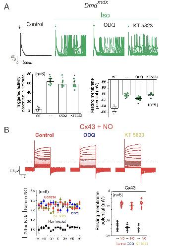 Fig S9. Nitric oxide canonical pathway (cGMP-PKG) does not mediate TA in isolated cardiomyocytes and Cx43 hemichannels activation. A) Representative action potentials traces from Dmdmdx 1051 isolated cardiomyocytes. Cells were stimulated with 1μM Iso in the absence or presence of ODQ (a highly selective, irreversible, inhibitor of soluble guanylyl cyclase) or KT 5823 (selective protein kinase G inhibitor) contained inside the pipette: ODQ (3 µM) and KT 5823 (1 µM). Arrow indicates electrical stimulation pulse. Note that both inhibitors ODQ and KT 5823 did not affect the TA and the Vm induced by Iso stimulation. The number in parentheses indicates the n value. Comparisons between groups were made using two-way ANOVA plus Tukey post-hoc test *P<0.05 vs WT. B) Representative current traces after application of 10 μM DEENO in an oocyte expressing Cx43 in the absence or presence of intracellular injections of ODQ (3 µM final intracellular concentration) and KT 5823 (1 µM final intracellular concentration). Oocytes were clamped to −80 mV, and square pulses from −80 mV to +90 mV (in 10 mV steps) were then applied for 2s. Normalized currents were obtained from the ratio between recorded current after and before DEENO treatment. Note that soluble guanylyl cyclase and protein kinase G inhibition did not significantly affect NO-induced hemichannel currents in oocytes expressing Cx43. |
