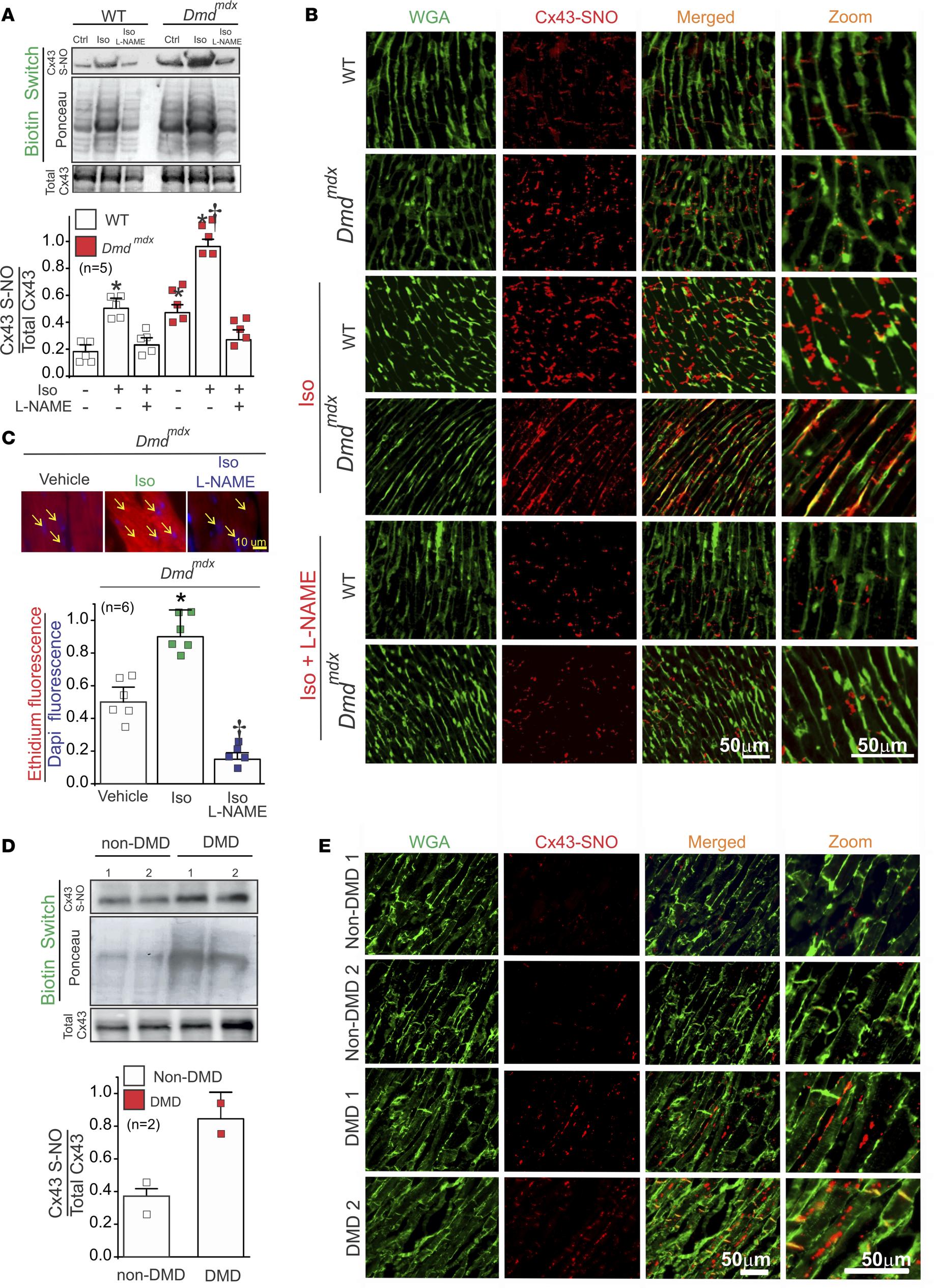 Figure 3 Iso increases S-nitrosylated levels of Cx43 at the lateral side of Dmdmdx cardiomyocytes. (A) Top and middle gels were loaded with S-nitrosylated proteins pulled down from heart samples using the biotin switch assay. Top gel was, then, blotted against Cx43, and the middle gel is the corresponding Ponceau staining. Lower blot was loaded using total cardiac proteins and blotted against Cx43. The bottom graph is the quantification for 5 independent blots using the ratio for S-nitrosylated Cx43/Ponceau. The number in parentheses indicates the n value. Comparisons between groups were made using 2-way ANOVA plus Tukey’s post hoc test. *P < 0.05 vs. WT control, and †P < 0.05 vs. WT Iso. (B) Analysis performed by PLA of the interaction between Cx43 and S-nitrosylation. Plasma membrane stained with wheat germ agglutinin (WGA) and S-nitrosylated Cx43 (Cx43-SNO) are shown in green and red, respectively. Representative images of n = 5 per group. (C) Assessment of Cx43 hemichannel activity in isolated Dmdmdx hearts perfused with buffer containing 5 μM ethidium bromide after or without treatment with Iso. Arrows show nuclei. The number in parentheses indicates the n value. Comparisons between groups were made using 2-way ANOVA test plus Tukey’s post hoc test. *P < 0.05 vs. vehicle WT; †P < 0.05 vs. vehicle Dmdmdx. (D) Top and middle gels were loaded with S-nitrosylated proteins pulled down from human heart samples using the biotin switch assay. Top gel was, then, blot against Cx43 and the middle gel is the corresponding ponceau staining. Lower blot was load using total cardiac proteins and blot against Cx43. (E) Analysis performed by PLA of the interaction between Cx43 and S-nitrosylation in human samples. Note that Cx43 is S-nitrosylated at the lateral side of DMD human samples compare to non-DMD. |