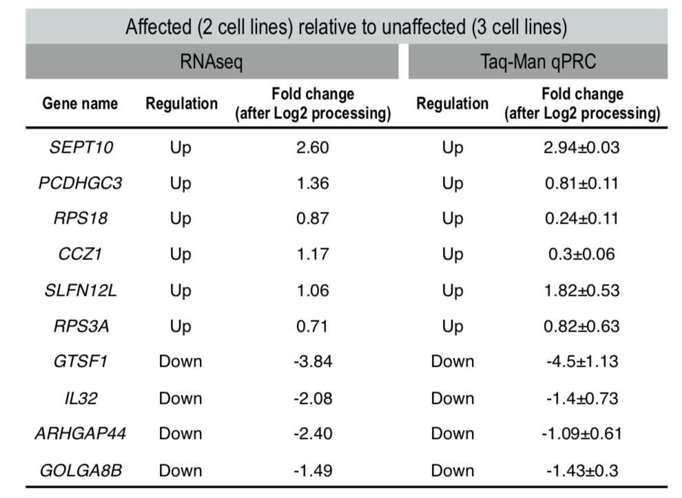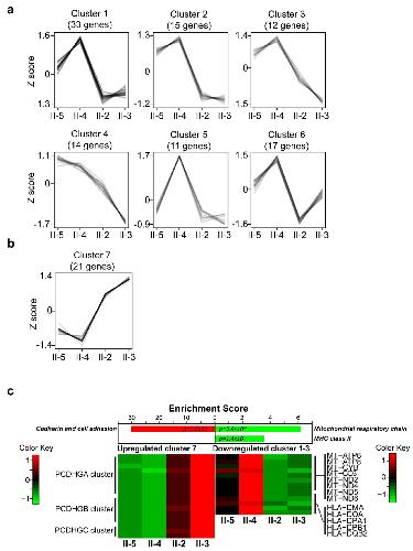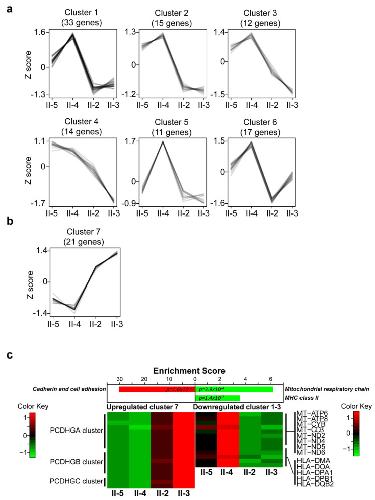 Figure 1 Clusters of expression profiles of differentially expressed genes (DEGs) and expression levels. (a) Six different expression clusters were obtained from downregulated genes. (b) One expression cluster was identified from the upregulated genes. (c) Expression level changes were detected in three functional groups in affected lymphoblastoid cell lines (LCLs). The expression levels of three PCDHG gene clusters (PCDHGA, PCDHGB, and PCDHGC) were upregulated in LCLs from affected members. Eight mitochondria-related genes and five MHC class II-related genes showed reduced expression levels in affected-members LCLs. The functional enrichment scores were obtained by using DAVID bioinformatics. Three significant functional groups with false discovery rate (FDR) < 0.05 were obtained, and the expression levels of genes within these groups are shown. |