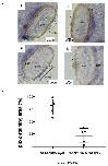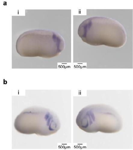 Figure 3 Cont. rad21mut disrupts the migration of neural crest cells (NCCs) in stage-25 Xenopus laevis. (a) The in situ hybridization pattern of twist1 was altered in the rad21mut-injected side. Panel i and ii show twist1 expression on both sides of the same non-injected embryo. The patterns around the optic cup (oc) and the neural crest migration streams into branchial arches (ba) are intact (indicated by a dash circle and dark solid lines, respectively). Panel iii and iv show the non-injected side and the injected side of the same rad21mut-injected embryo. The optic cup and branchial arch in panel iii are similar to those in panel i and ii, whereas these patterns are disrupted in panel iv. A total of 20 rad21mut-injected embryos were used, and 18 of them showed disrupted patterns in the rad21mut-injected side (18/20). (b) The in situ hybridization pattern of ap2a is altered in rad21mut-injected X. laevis embryos. Panel i shows ap2a is highly expressed in the head region and the spinal cord (sc) in the non-injected side. Panel ii shows the ap2a expression pattern is disrupted in the rad21mut-injected side. A total of 11 rad21mut-injected embryos were used, and 9 showed disrupted staining patterns in the rad21mut-injected side (9/11, arrowhead). Panel iii and iv show higher magnifications of the non-injected side and rad21mut-injected side of another embryo. Similar to panel ii, disrupted neural crest migration streams are shown in panel iv. A total of 11 rad21mut-injected embryos were used, and 9 showed disrupted staining patterns in the rad21mut-injected side (9/11, arrowhead). (c) Quantification of the mandibular areas showing positive staining of ap2a and twist1. Means and standard deviations for three injected sides were analyzed in each group. Statistics was done by using paired t test; * indicates p < 0.05. |
