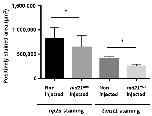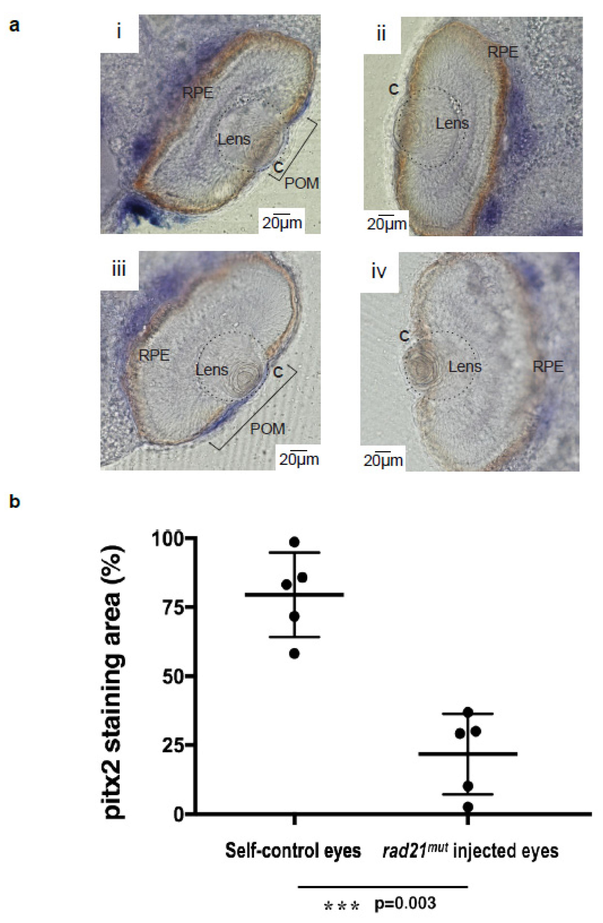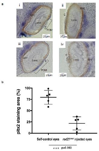 Figure 4 The expression of pitx2 was decreased by injecting rad21mut into X. laevis embryos. The transcription factor pitx2 is highly abundant in periocular mesenchymes (POM) and was used as a marker of POM. The lens is indicated by a dash circle. (a) Panel i and iii show the in situ hybridization expression pattern of pitx2 (blue) in the non-injected side of two X. laevis embryos at stage 41. The other sides of all five embryos (5/5) injected with rad21mut mRNAs showed a lack of pitx2 staining in the cornea (C) area (panel ii and iv). Normal structures of lens and retina layers could be observed in both the non-injected and the rad21mut-injected sides. (b) The quantification of pitx2-positive areas in the non-injected control eyes and the rad21mut-injected eyes was done using ImageJ. *** A significant decrease of staining corresponding to 57.7% was detected (p = 0.003). |