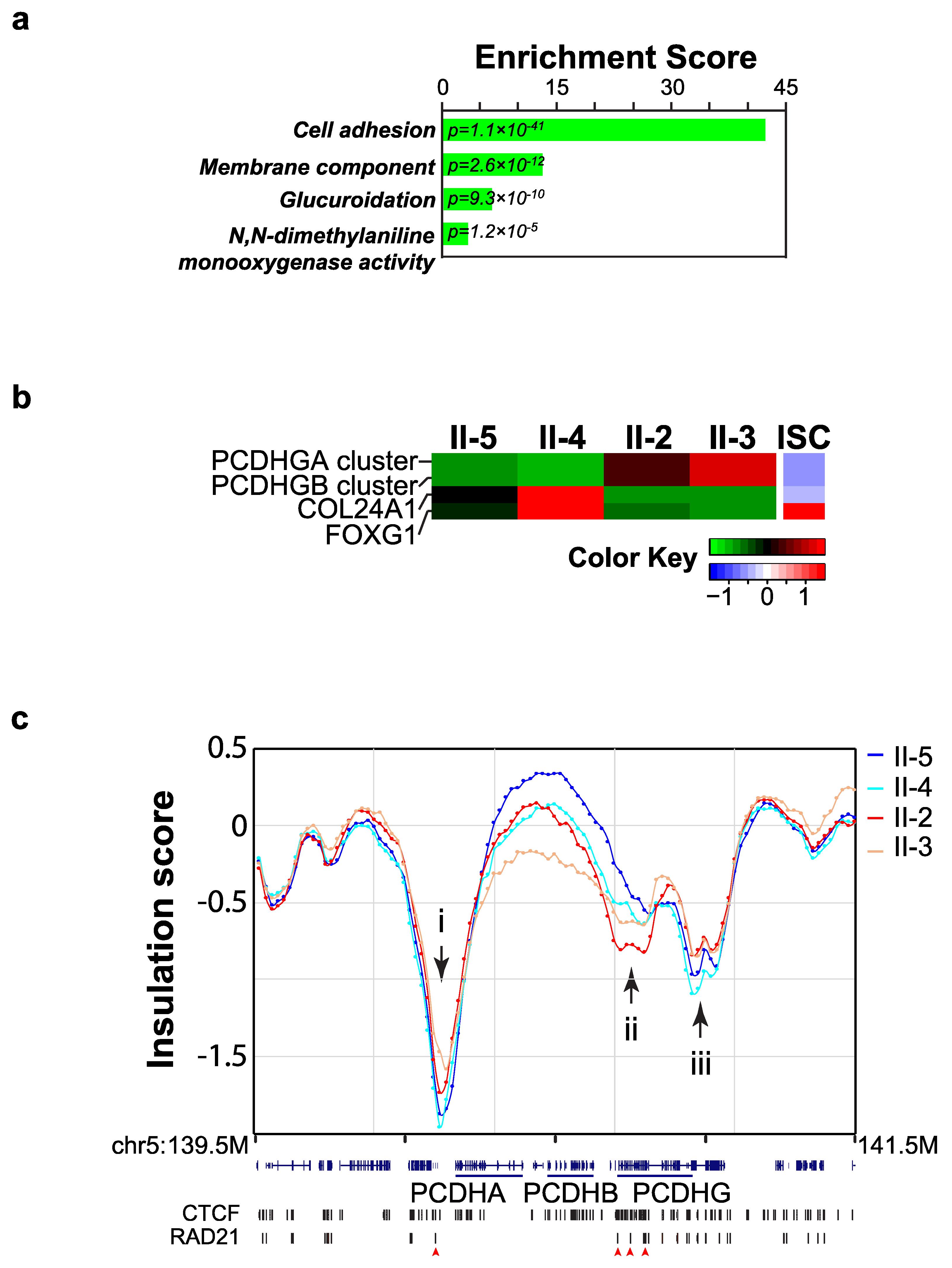 Figure 2 Local chromosome organization changes were detected in LCLs. (a) The coding genes overlapping with insulation score change (ISC) bins were chosen for functional enrichment analysis. Significant functional groups (FDR < 0.05) identified were cell adhesion, membrane components, glucuronidation, and N,N-dimethylaniline monooxygenase activity. (b) Local chromosome structural changes and gene expression changes in LCLs. Four differentially expressed genes/gene clusters showed changes in isolation scores, indicating local chromosome structural alterations may lead to expression changes in LCLs. (c) RAD21R450C caused insulation score changes in PCDH gene clusters. Insulation score profile across the PCDH gene clusters. Both of these loci showed CTCF and RAD21 binding signals (indicated by red arrowheads) in GM12878 cells. |