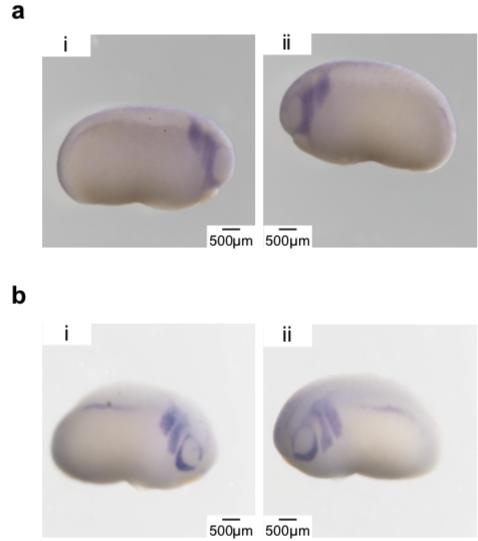 Figure 4. The expression of pitx2 was decreased by injecting rad21mut into X. laevis embryos. The transcription factor pitx2 is highly abundant in periocular mesenchymes (POM) and was used as a marker of POM. The lens is indicated by a dash circle. (a) Panel i and iii show the in situ hybridization expression pattern of pitx2 (blue) in the non-injected side of two X. laevis embryos at stage 41. The other sides of all five embryos (5/5) injected with rad21mut mRNAs showed a lack of pitx2 staining in the cornea (C) area (panel ii and iv). Normal structures of lens and retina layers could be observed in both the non-injected and the rad21mut-injected sides. (b) The quantification of pitx2-positive areas in the non-injected control eyes and the rad21mut-injected eyes was done using ImageJ. *** A significant decrease of staining corresponding to 57.7% was detected (p = 0.003). |