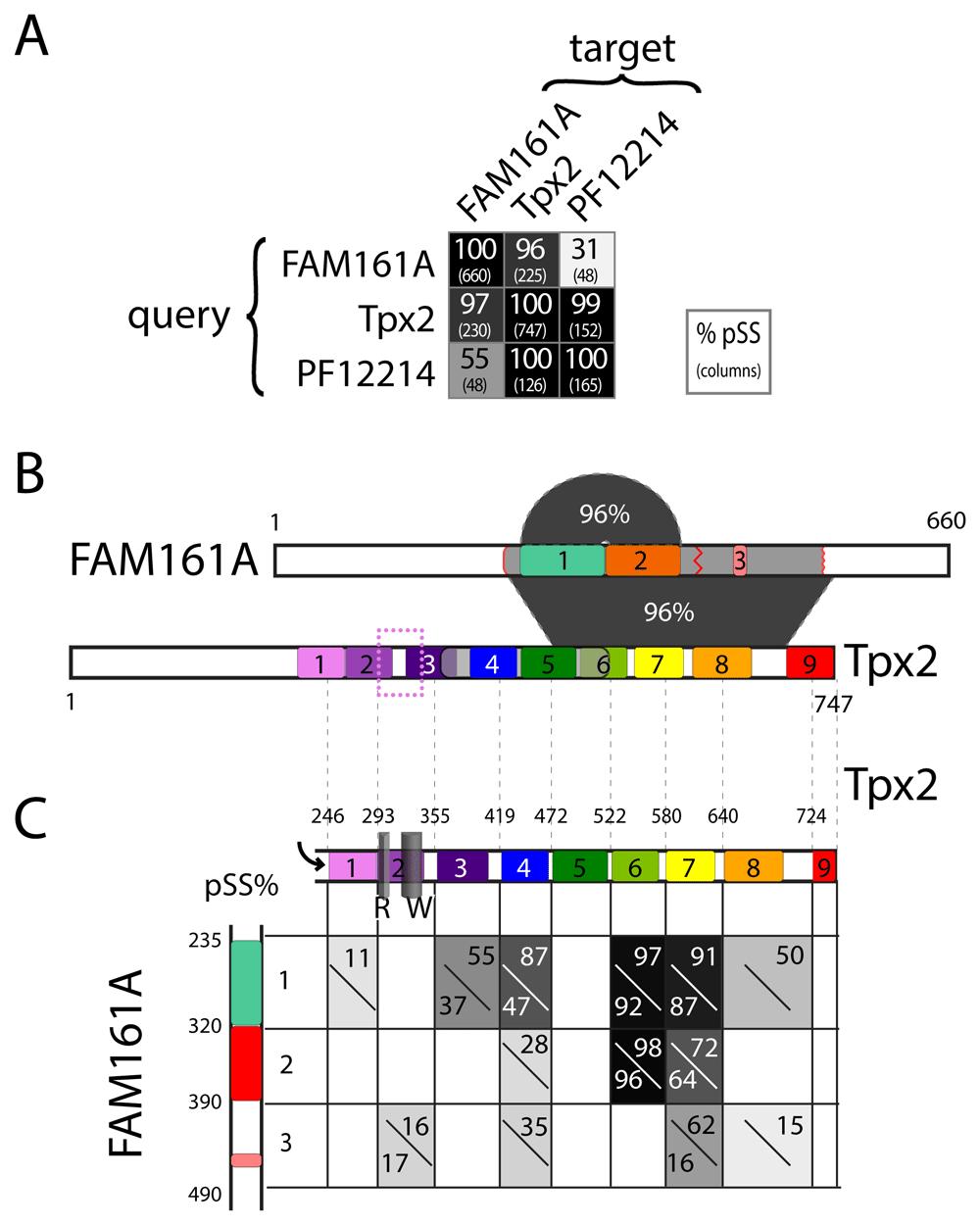 (A) Results of pair-wise HHpred searches between FAM161A, Tpx2 and the âTpx2_importinâ domain (PF12214, which covers residues 362-498 of Tpx2- see part B). The probability of shared structure (pSS, as %) and the number of columns (in brackets below) are reported for all pairwise searches. Results in PDB are identical to the human proteome, because Tpx2 is present in PDB as 6BJC_T with no additional DSSP secondary structural information. NB: self-searches (long diagonal) have pSS=100% and include all columns. (B) Alignment of FAM161A with Tpx2. 320 residues of FAM161A (229â548) align with 228 residues of Tpx2 (474-701), which spans repeats 5 to 8. The probability of shared structure (pSS) =96%. Two adjacent repeats in FAM161A (79 and 88 residues, 239-317 and 318-395, both within the portion homologous to UPF0564) also align (pSS=96%, shaded semi-circle). Tpx2 repeats are coloured in a rainbow from violet to red. The region included in a cryo-EM structure with tubulin (residues 300-341) is shown by the dotted purple box. The region included in PF12214 is shown by the grey transparent box from repeat 3 to 6. (C) pSS of pairwise comparisons of each repeat in FAM161A and Tpx2, where repeat boundaries are 25 residues down-stream of those in B (arrow). Shading of each cell represents the average pSS of two searches on a grey scale with pSS from 10-100% repesented by grey 10-100%, with FAM161A as query (bottom left); and with Tpx2 as query (top right). The structures labelled R and W in repeat 2 of Tpx2 are the ridge and wedge that bind tubulin (see Figure 3).
