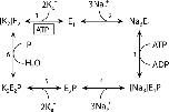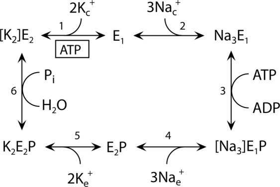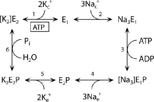 Figure 1. Na+, K+-ATPase reaction cycle. E1 and E2 represent the main conformational states of the enzyme. P indicates phosphorylated states. E1P and E2P are the respective ADP-sensitive and ADP-insensitive (K+ sensitive) phosphoenzyme intermediates2. Occluded Na+ and K+ ions3 are shown in brackets. Free ions are labelled c and e for cytoplasmic and extracellular side, respectively. Boxed ATP indicates ATP bound in a non-phosphorylating mode, enhancing the rate of K+ deocclusion, and accompanying E2-E1 conformational change2. The partial reactions of the cycle are numbered 1–6. |