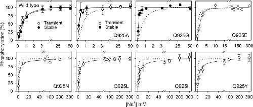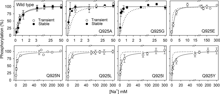 Figure 2. Na+ dependence of phosphorylation. Phosphorylation was carried out for 10 s at 0 °C with 2 μM [γ-32P]ATP in 20 mM Tris (pH 7.5), 3 mM MgCl2, 1 mM EGTA, 20 μg oligomycin/ml (to prevent dephosphorylation), ouabain to inhibit the endogenous COS-1 cell Na+, K+-ATPase (10 μM for stably expressed enzyme and 100 μM for transiently expressed enzyme), and various concentrations of NaCl (and NMG+ to maintain the same ionic strength at all NaCl concentrations). For further details, see Methods. Symbols with error bars represent mean ± s.d. Open and closed symbols represent transiently and stably expressed enzyme, respectively. Each line represents the best fit of a Hill function (Eq. 1 of Methods). Extracted K0.5 values are listed in Table 1 with statistical information. Dotted lines reproduce the corresponding wild type for direct comparison in the same panel (only the stably expressed wild type is shown in the panel with Q925A). |