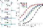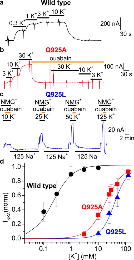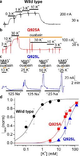 Figure 5. K+-concentration dependence of Na+, K+-ATPase currents in oocytes. (a–c) Representative current recordings at –50 mV (black, red, and blue traces). (a) Wild type-injected oocyte exposed to increasing concentrations of K+ (black lines) while bathed in NMG+ solution. K+-induced currents were fully saturated at 3 mM K+. (b) A similar experiment in an oocyte injected with Q925A. Here, much larger K+ concentrations (black lines) were required to activate Na+, K+-ATPase currents. Ouabain (10 mM, orange line) completely inhibited the K+-induced currents. (c) An oocyte injected with Q925L was exposed to 10 mM K+ (black line) followed by 10 mM ouabain (orange line), in NMG+ solution. Upon ouabain withdrawal in Na+ solution (black line) to recover from ATPase inhibition, the solution was switched to NMG+ where 25 mM K+ and subsequently ouabain were applied, uncovering Na+, K+-ATPase currents. The manoeuvres were repeated with 50 and 125 mM K+. (d) K+-concentration dependence of the current at –50 mV. Data points represent the mean ± s.d. Line plots are the Hill equations (Eq. 4. in Methods) fitted to the data from individual oocytes, with the K0.5 and statistics shown in Table 3. The global fit of the experiments used a single Hill coefficient shared among all the experiments for each mutant, with values n = 1.3 ± 0.1 for wild type, n = 1.3 ± 0.1 for Q925A and n = 1.8 ± 0.2 for Q925L (s.e.m. values as obtained from the fitting program). For wild type, the K+-induced currents obtained in the absence of ouabain are shown. For Q925A and Q925L, the ouabain-inhibited part of the currents are shown at all K+ concentrations, thereby eliminating contributions from K+ channels at high K+ concentrations. |