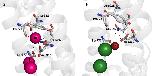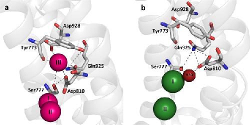 Figure 7. Ion-binding sites in Na+, K+-ATPase crystal structures with indication of Q925 (Gln925) and other relevant site-III residues. (a) Na+-bound [Na3]E1·AlF4− ADP form (mimicking the transition state between Na3E1 and [Na3]E1P, see Fig. 1), Protein Data Bank code 3WGV, chain A (protomer B)14. Na+ ions are shown as pink spheres numbered I, II, and III according to standard nomenclature. (b) K+-bound [K2]E2·MgF42– form (mimicking the [K2]E2·Pi intermediate between K2E2P and [K2]E2), Protein Data Bank code 2ZXE13. K+ ions are shown as green spheres numbered I and II, and the associated water molecule is red. View along the plane of the membrane with the intracellular side up, for both structures. Selected residues are shown in stick representation coloured according to the elements (carbon, grey; oxygen, red; nitrogen, blue) and numbered according to the rat α1-isoform (Q925 of rat α1 corresponds to Q923 and Q930 in the crystallized pig α1 and shark rectal gland enzymes, respectively). Broken lines indicate potential hydrogen bonds or coordination bonds between ions and oxygen ligands of residue side chains. |