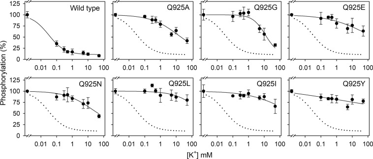 Figure 3. K+ inhibition of phosphorylation. Phosphorylation with [γ-32P]ATP was carried out for 10 s at 0 °C with 2 μM [γ-32P]ATP in 20 mM Tris (pH 7.5), 50 mM NaCl, 3 mM MgCl2, 1 mM EGTA, ouabain to inhibit the endogenous COS-1 cell Na+, K+-ATPase, and various concentrations of KCl (with choline chloride to maintain a constant ionic strength). In these experiments, oligomycin was absent to allow dephosphorylation. For further details, see Methods. Symbols with error bars represent mean ± s.d. Each line represents the best fit of Eq. 2 of Methods. Extracted IC50 values are listed in Table 1 with statistical information. Dotted lines reproduce the wild type for direct comparison in the same panel. |
