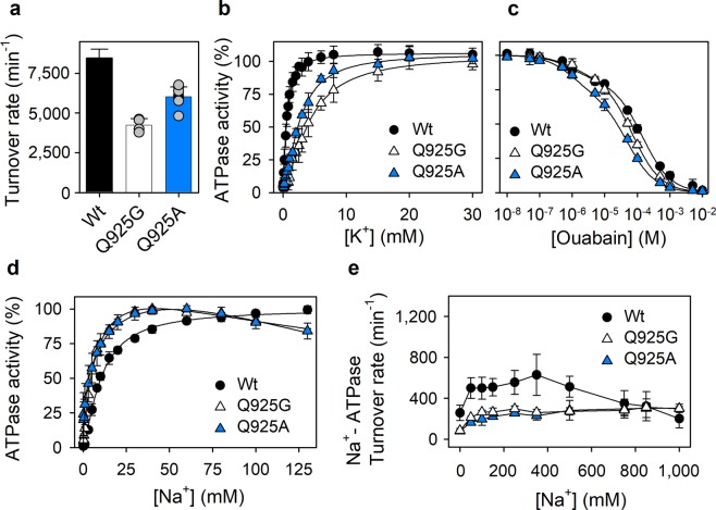 Figure 4. ATPase activity of stably expressed Q925A and Q925G mutants. The ATPase activity was determined at 37 °C in medium containing 30 mM histidine (pH 7.4), 1 mM EGTA, 3 mM MgCl2, and 3 mM ATP, together with the NaCl, KCl, and ouabain additions indicated below. Symbols and columns with error bars represent mean ± s.d. The lines show the best fits of the equations from Methods indicated below. Extracted parameters are listed in Table 2. Turnover rates were calculated as the ratio between the ATPase activity and the active site concentration (see Methods). (a) Medium additions: 130 mM NaCl, 20 mM KCl, and 10 μM ouabain. Individual data points are shown as grey circles. (b) Medium additions: 40 mM NaCl, 10 μM ouabain, and KCl as indicated. The extrapolated value corresponding to infinite K+ concentration was taken as 100%. Eq. (1) used for fitting. (c) Medium additions: 130 mM NaCl, 20 mM KCl, and ouabain as indicated. Eq. (3) used for fitting. (d) Medium additions: 20 mM KCl, 10 μM ouabain, and NaCl as indicated. The maximum was taken as 100%. K0.5 values for activation obtained by fitting Eq. 1. to the rising part of the Na+ dependence are listed in Table 2. The inhibition phase at high Na+ concentrations is caused by competition of Na+ with K+ at extracellular-facing sites due to low K+ affinity of the mutants. (e) Medium additions: 10 μM ouabain and NaCl as indicated, no KCl was present. |