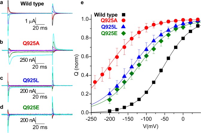 Figure 6. Transient charge movement in 125 mM Na+ without external K+. (a–d) Ouabain-sensitive currents elicited by voltage pulses from –50 mV to –180 mV (cyan), −140 mV (green), −100 mV (magenta), −60 mV (blue), −20 mV (red) and + 20 mV (black), in representative oocytes injected with wild type (a), Q925A (b), Q925L (c) and Q925E (d). (e) Normalized charge-voltage plots. Data points represent the mean ± s.d. Line plots are Boltzmann distributions (Eq. 5 in Methods) fitted to individual experiments with slope factors 38 mV for wild type, 46 mV for Q925A, 48 mV for Q925L, and 46 mV for Q925E. V0.5 values, and the corresponding fold changes in Na+ affinity calculated, are shown in Table 3 with further information on statistics. |