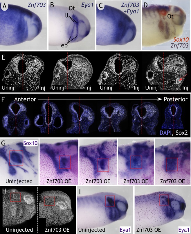 Znf703 is an RAR- and Wnt-inducible transcription factor that exhibits a complex expression pattern in the developing embryo: Znf703 mRNA is found in the early circumblastoporal ring, then later throughout the neural plate and its border, and subsequently in the mid/hindbrain and somites. We show that Znf703 has a different and separable function in early mesoderm versus neural crest and placode development. Independent of its early knockdown phenotype on Gdf3 and Wnt8, Znf703 disrupts patterning of distinct neural crest migratory streams normally delineated by Sox10, Twist, and Foxd3 and inhibits otocyst formation and otic expression of Sox10 and Eya1. Furthermore, Znf703 promotes massive overgrowth of SOX2+ cells, disrupting the SoxB1 balance at the neural plate border. Despite prominent expression in other neural plate border-derived cranial and sensory domains, Znf703 is selectively absent from the otocyst, suggesting that Znf703 must be specifically cleared or down-regulated for proper otic development. We show that mutation of the putative Groucho-repression domain does not ameliorate Znf703 effects on mesoderm, neural crest, and placodes. We instead provide evidence that Znf703 requires the Buttonhead domain for transcriptional repression.
