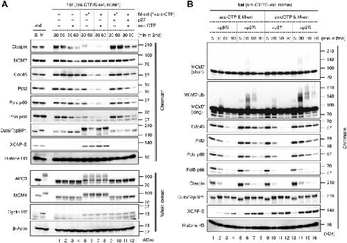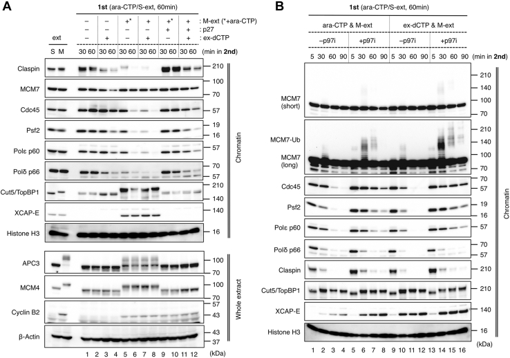 Figure 2. Mitotic replisome disassembly is mediated by p97 both at perturbed and unperturbed replication forks. AâB, the same experiment with Figure 1B was performed, and the chromatin fractions and the whole extract were subjected to immunoblotting. In the second reaction as shown in panel B, the samples were incubated for up to 90 min in the absence or presence of p97 inhibitor NMS-873 (âp97i, +p97i). Histone H3 and β-actin served as the loading control for chromatin fraction and whole extract, respectively. p97i, p97 inhibitor. |