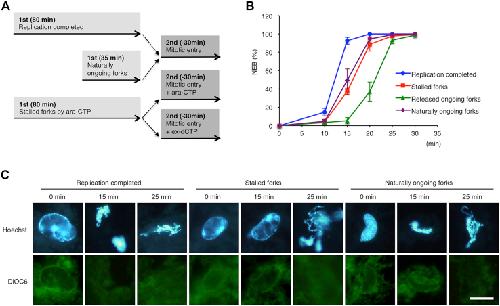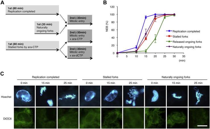 Figure 4. The kinetic and morphological comparison of the nuclear envelope breakdown between replication-completed nuclei, nuclei with stalled forks, and nuclei with released and naturally ongoing forks. A, experimental strategy. Without replication stress, sperm nuclei generally replicate their genomic DNA in 30 to 60 min in the S-phase egg extract. Therefore, there are naturally ongoing forks at 35 min and no forks at 80 min. Stalled forks are stabilized at 80 min in the presence of Ara-CTP. Then, mitotic entry was induced in the presence or absence of Ara-CTP or ex-dCTP, and nuclei were fixed at each time point and observed by microscopy. B, the time courses of the NEB rates were determined as in Figure 3. The same experiments were repeated three times. Error bar, ± SD. C, the pictures of nuclei representative at each time point. The genomic DNA and nuclear envelope were stained with Hoechst 33258 and DiOC6, respectively. Bar, 20 μm. Ara-CTP, Ara-cytidine-5â²-triphosphate; DiOC6, 3,3â²-dihexyloxacarbocyanine iodide. |