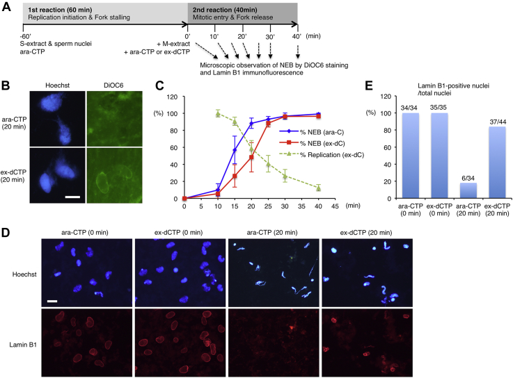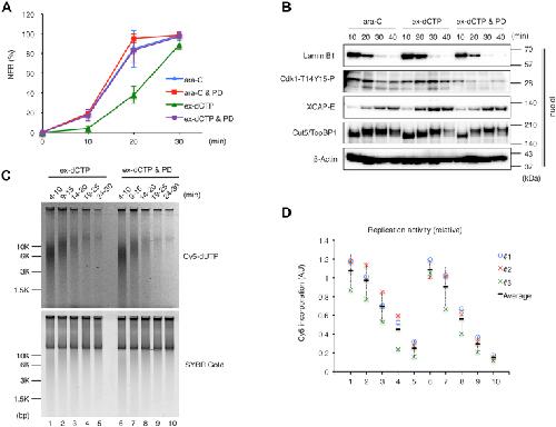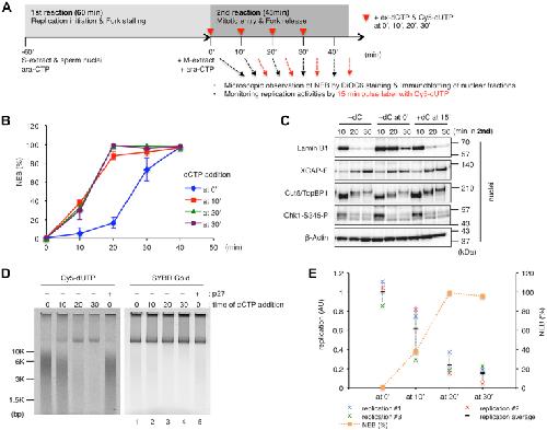 Figure 6. Stalled replication forks fail to restart after the nuclear envelope breakdown. A, experimental strategy. BâD, after the first reaction, an M-phase extract and Ara-CTP were added to the reaction mixture and then equally divided into four (B and D) or three pieces (C), to each of which excess amount of dCTP (ex-dCTP, dC) was added at 0, 10, 20, and 30 min (B and D) (at 0â², at 10â², at 20â², at 30â²) or at 0 and 15 min (C) (at 0â² and at 15â²) in the second reaction. B, the time courses of the average NEB rates of each sample were measured as in Figure 3 and shown in the graph. The same experiments were repeated three times. Error bar, ± SD. C, nuclear fractions were isolated at each time point and subjected to immunoblotting. The samples without excess dCTP addition were also prepared (âdC). D, in the second reaction, Cy5-dUTP was added at the same time with ex-dCTP and further incubated for 15 min, and the genomic DNA was isolated and subjected to 0.8% TAE agarose gel electrophoresis. The same experiments were repeated three times, and the relative replication activities are plotted in the graph in panel E together with the NEB rate at the time when ex-dCTP was added. Error bar, ± SD. Ara-CTP, Ara-cytidine-5â²-triphosphate. |