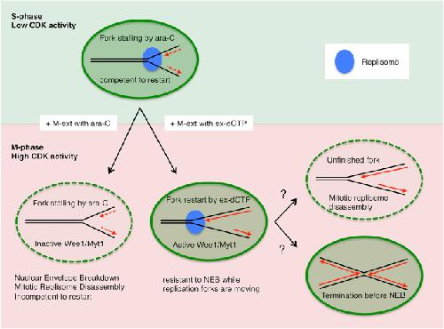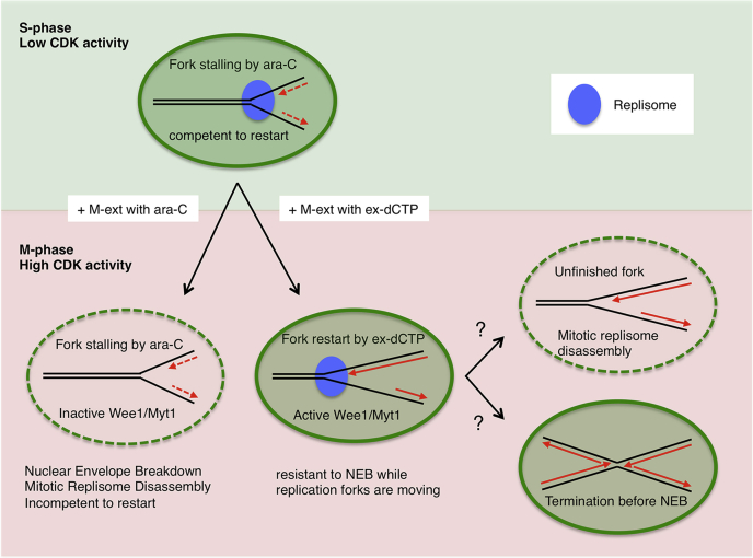 Figure 8. Replication forks arrested by Ara-CTP are kept competent to restart in the S phase. Without excess dCTP, mitotic entry drives the nuclear envelope breakdown (NEB) and replisome disassembly, rendering stalled forks unable to restart. In contrast, DNA replication efficiently resumes with excess dCTP while the NEB is delayed in a Wee1/Myt1âdependent manner. It is unclear whether released forks accomplish DNA replication or are subjected to mitotic replisome disassembly on the way. Ara-CTP, Ara-cytidine-5â²-triphosphate. |