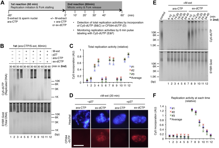 Figure 1. Stalled replication forks can restart during early mitosis when replication stress is relieved. A, experimental strategy. B, in the first reaction, sperm nuclei were incubated in an S-phase extract (S-extract) with Ara-CTP for 60 min. In the second reaction, an equal volume of the M-phase extract (M-extract) containing Cy5-dUTP and Ara-CTP or excess dCTP (ex-dCTP) was added to the first reaction mixture and further incubated for 30 to 60 min. Then, genomic DNA was isolated and subjected to 0.8% TAE agarose gel electrophoresis, followed by SYBR Gold staining. Detected fluorescent signals of Cy5 and SYBR Gold show replicated DNA and total DNA, respectively. Recombinant His-p27 (p27) was added to inhibit CDK activities and mitotic entry. C, the same experiment in panel B was repeated three times, and the signal intensities of Cy5 were quantified by ImageJ. The replication activity obtained after 90 min incubation in the S-phase extract under unperturbed condition was used as a control for normalization. The relative replication activities were plotted in the graph. Error bar, ± SD. D, the same experiment in panel B was performed using CF594-dUTP instead of Cy5-dUTP to detect replication activity. After 30 min in the second reaction, nuclei were fixed and observed by fluorescence microscopy. Nuclear DNA was stained with Hoechst 33258. Bar, 20 μm. EâF, replication activities at each time point were monitored by pulse labeling with Cy5-dUTP added 6 min before isolating genomic DNA, which was analyzed in a similar way as shown in panels BâC. The replication product at 10 min in the presence of ex-dCTP and p27 was used as the control. Ara-CTP, Ara-cytidine-5â²-triphosphate; CDK, cyclin-dependent kinase. |