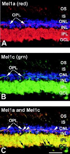 High magnification light micrograph merged image of the X. laevis retina double-labelled with Mel1a (red) and Mel1c (grn) antibodies. Mel1c immunoreactivity is present alone in the photoreceptor IS (white arrows), but not in the outer segments (OS). Also, Mel1c immunoreactivity is present alone in proximal regions of the OPL (black arrows), and in the ganglion cell soma (black arrows). Mel1a immunoreactivity is present alone in the distal portion of the OPL (large arrowheads). Co-localization of Mel1a and Mel1c immunoreactivity, as indicated by the yellow fluorescence, is present as a broad band in the IPL. There is also a small amount of yellow fluorescence in the distal portion of the OPL (small arrowheads), which may represent the close approximation of the photoreceptor synaptic terminals (green), and some horizontal cell processes (red). Scale bar represents 100 μm.