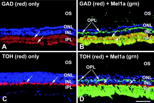 Double label immunocytochemistry of Mel1a melatonin receptor with GAD and TOH in the X. laevis retina. The Mel1a melatonin receptor antibody appears to label both GABA-ergic and dopaminergic cell processes in the IPL. The melatonin receptor labelling is green, the GAD and TOH labelling is red, and the nuclear stain is blue. (A) GABA-ergic neuronal cell processes are labelled with an antibody to glutamate decarboxylase (GAD, arrows), in the distal and proximal layers of the IPL. (B) Some degree of co-localization of the Mel1a receptor and GAD is suggested by the yellow and orange fluorescence. (C) Dopaminergic cell processes are labelled with an antibody to tyrosine hydroxylase (TOH, arrows) located in sublamina 1 of the IPL, and some punctate labelling in sublamina 5. (D) The green labelling of the Mel1c receptor and the red labelling of the TOH results in a yellow fluorescence in the proximal portion of sublamina 1 (black arrows), which is suggestive of co-localization. However, in the distal portion of sublamina 1, only TOH immunolabelling is observed (white arrows). Scale bar represents 50 μm.