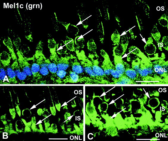 Confocal image of Mel1c immunoreactivity in the photoreceptor layers. Mel1c immunoreactivity is present in the photoreceptor inner segments (IS; arrows), but not in the outer segments (OS; the axoneme labelling is also seen in control sections). Also, Mel1c immunoreactivity is present in distal regions of the OPL directly adjacent to photoreceptor nuclei in the outer nuclear layer (ONL), and may represent photoreceptor synaptic terminals. The oblique orientation and cross sections of photoreceptor IS reveal the plasma membrane localization of the Mel1c receptor (arrows). In the IS, Mel1c labelling is exclusively present on the plasma membrane (arrows). The illusion of Mel1c immunoreactivity filling the IS is due to the thickness of the tissue sections, showing the immunoreactivity of the cell membrane as it spans the width of the IS. Scale bars represent 50 μm.