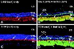 Immunocytochemistry of the X. laevis retina with Mel1a and Mel1c melatonin receptor antibodies. Fixed cryostat sections of Xenopus retina were incubated with the Mel1a receptor antibody or with antibody plus excess Mel1a or Mel1c peptide (controls). The primary antibody was labelled with a green fluorescent dyeâantibody conjugate, and counter stained with a blue nuclear dye. (A) Specific Mel1a immunolabelling is observed in the OPL (arrowheads), IPL, and GCL. The photoreceptor outer segments (OS) do not demonstrate specific immunolabelling. (B) Mel1a antibody pre-incubation with Mel1a antigen peptide blocks all specific immunoreactivity. (C) Mel1a antibody pre-incubation with Mel1c antigen peptide does not diminish Mel1a immunoreactivity. Scale bar represents 50 μm.