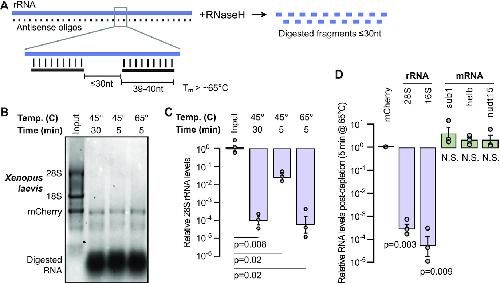Figure 1. (A) Schematic of rRNA depletion strategy using 39–40 nt antisense oligos spaced ≤ 30-nt apart. (B) X. laevis stage 0 total RNA (input, lane 1) and with rRNA depletion using different reaction conditions visualized on a 1% formaldehyde 1.2% agarose gel. In vitro transcribed mCherry mRNA was spiked into the input RNA prior to digestion. (C) qRT-PCR comparing 28S rRNA levels in X. laevis stage 0 total RNA (input, left) versus depletion conditions normalized to mCherry. P values are from two-tailed paired t tests comparing depleted samples to their corresponding total RNA input. (D) qRT-PCR measuring mCherry-normalized rRNA and mRNA levels in X. laevis stage 0 rRNA-depleted samples divided by levels in untreated samples. P values are from two-tailed paired t tests for each gene comparing depleted samples to their corresponding total RNA input. N.S. = not significant. |