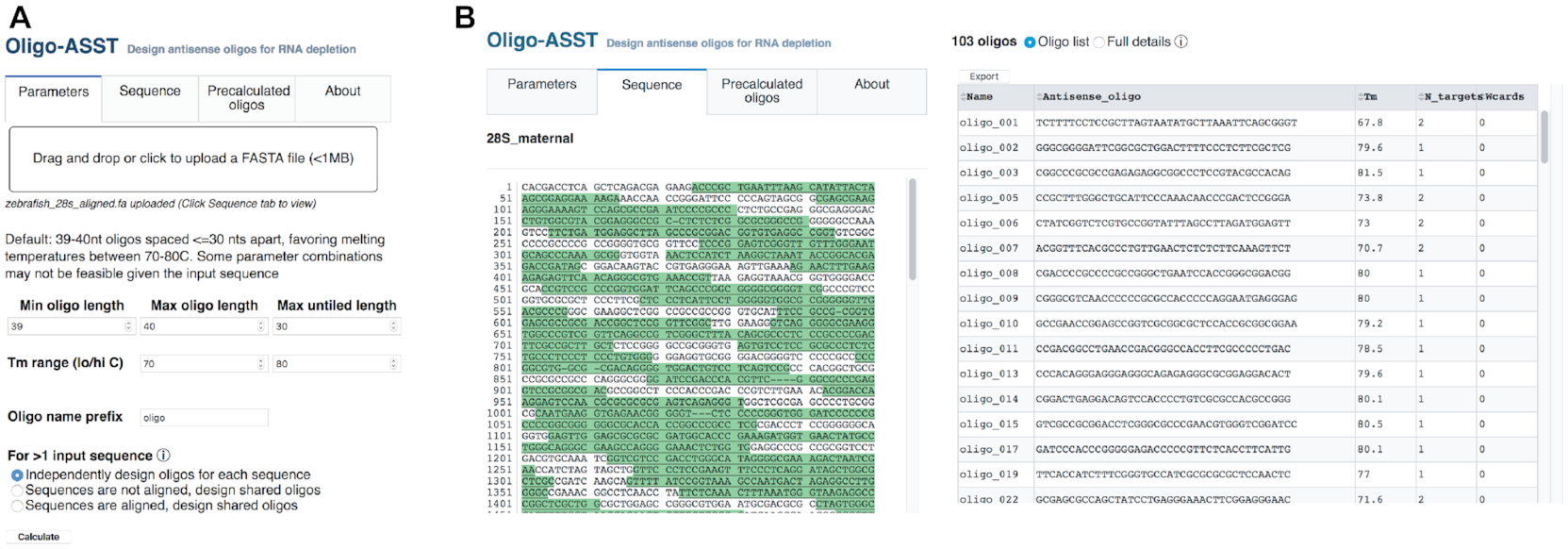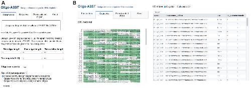 Figure 5. (A) The Oligo-ASST Web interface allows users to upload a FASTA file for target sequences and select parameters for oligo design. (B) Designed oligos are highlighted in a sequence viewer (left) and listed in the right pane in abbreviated form or with full details (not shown), which can be downloaded in text format. |