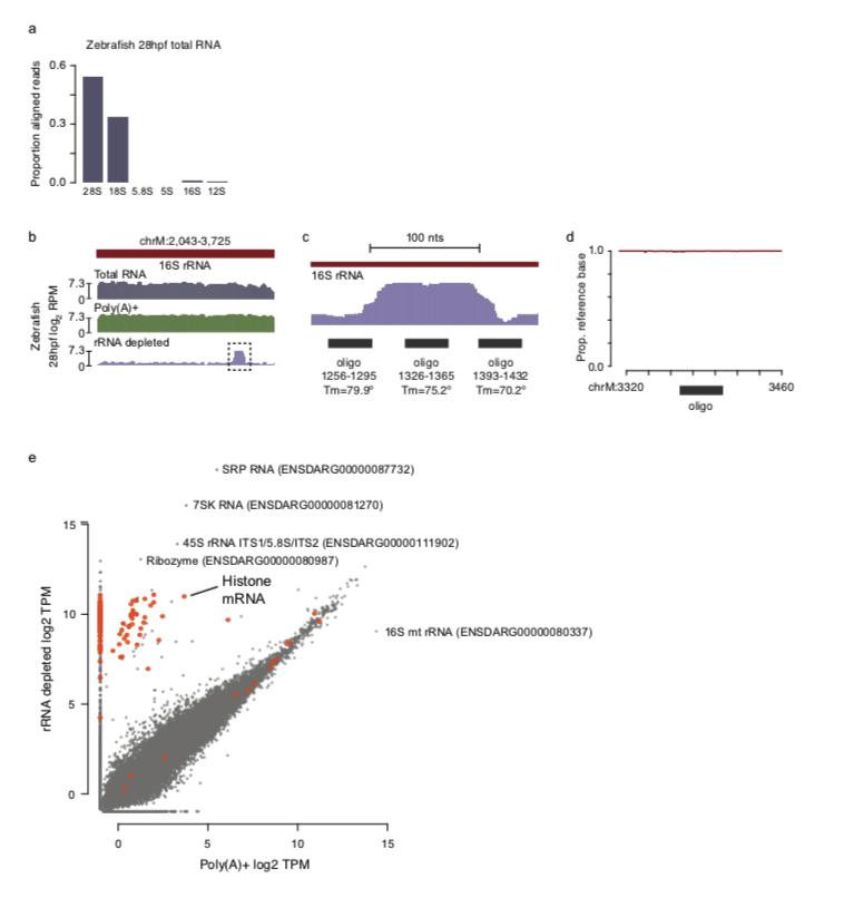 Supplementary Figure S3: a) Barplots showing proportion of aligned reads from untreated total RNA mapping to rRNA species in zebrafish. b) Genome browser tracks comparing read coverage at the 16S rDNA loci in untreated, poly(A)+ and rRNA depleted libraries from zebrafish 28 h.p.f. embryos. One region with less efficient rRNA depletion is boxed. c) Zoomed browser track for the boxed region in (b) showing that the inefficient digestion occurred over the region targeted by one oligo (positions 1326-1365 relative to the 16S sequence). This likely resulted in rRNA fragments that were slightly too large to be efficiently excluded during cleanup and library build. d) Variant analysis of sequencing reads mapping to chrM:3320-2460 showing that nearly all read sequences match the GRCz11 reference sequence, suggesting that there is no defect in the oligo’s ability to target; rather, it is likely that this oligo was omitted from the pool in error. e) Biplot comparing log2 TPM expression levels from poly(A)+ and rRNA- depleted libraries at 28 h.p.f. Histone genes are highlighted in orange. Several highly expressed non- coding RNAs are labeled. h.p.f. = hours post fertilization, RPM = reads per million, Tm = melting temperature, TPM = transcripts per million. |