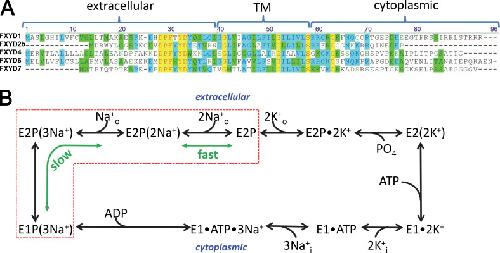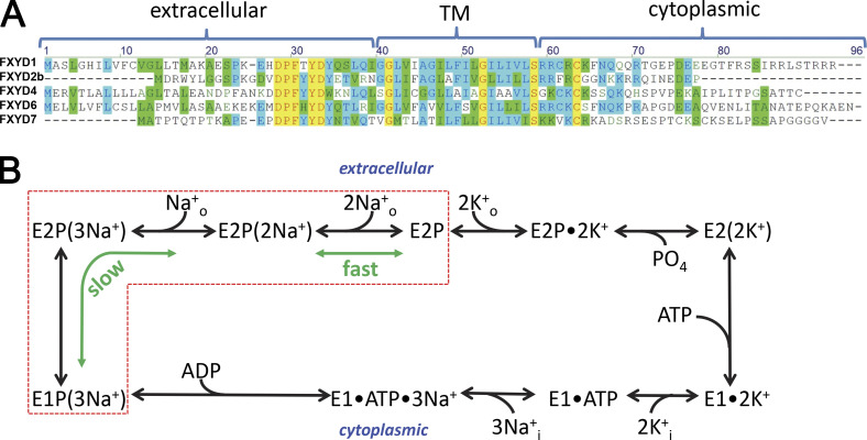 Figure 1. FXYD amino acid sequence alignment and Na/K pump enzymatic cycle. (A) Alignment of the five human FXYD isoforms studied in this work. Residues in the transmembrane (TM), cytoplasmic, and extracellular regions of the isoforms are indicated. (B) Post-Albers kinetic scheme of the Na/K pump cycle (clockwise forward direction). The pump alternates between two major conformations, E1 and E2, which can exist in dephosphorylated or phosphorylated (P) forms. Parentheses indicate ions occluded within the protein. Transitions within the red box produce transient charge movement: the release of the first Na+ (forward cycle) or rebinding of the last Na+ (backward cycle) during E1P(3Na+) ↔ E2P(2Na+) + Na+o produces the slow transient charge movement, while the release of the last two Na+ ions (forward cycle) or rebinding of the first two Na+ ions (backward cycle) during E2P(2Na+) ↔ E2P + 2Na+o produces fast charge movement. |