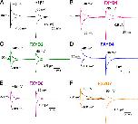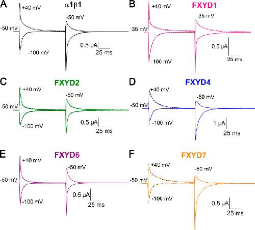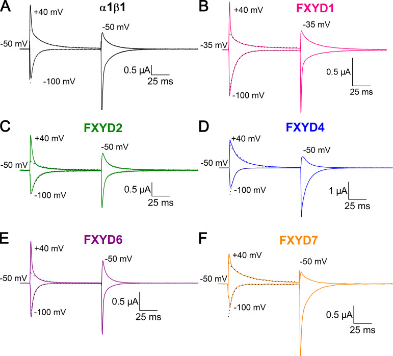 Figure 3. Effect of FXYD subunits on transient currents. (AâF) Ouabain-sensitive currents elicited by voltage steps from the holding potential to â100 and +40 mV recorded from oocytes bathed in external Na+ solution 3â6 d after injection with α1β1 (A), α1β1FXYD1 (B), α1β1FXYD2 (C), α1β1FXYD4 (D), α1β1FXYD6 (E), or α1β1FXYD7 (F). The oocyte in B was held at â35 mV, and the rest were held at â50 mV. Depolarizing voltage pulses from the holding potential produce transient outward currents, whereas hyperpolarizing voltage pulses produce transient inward currents. The dashed lines are monoexponential fits to the current, beginning 3 ms after the voltage step. |