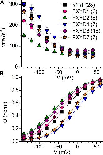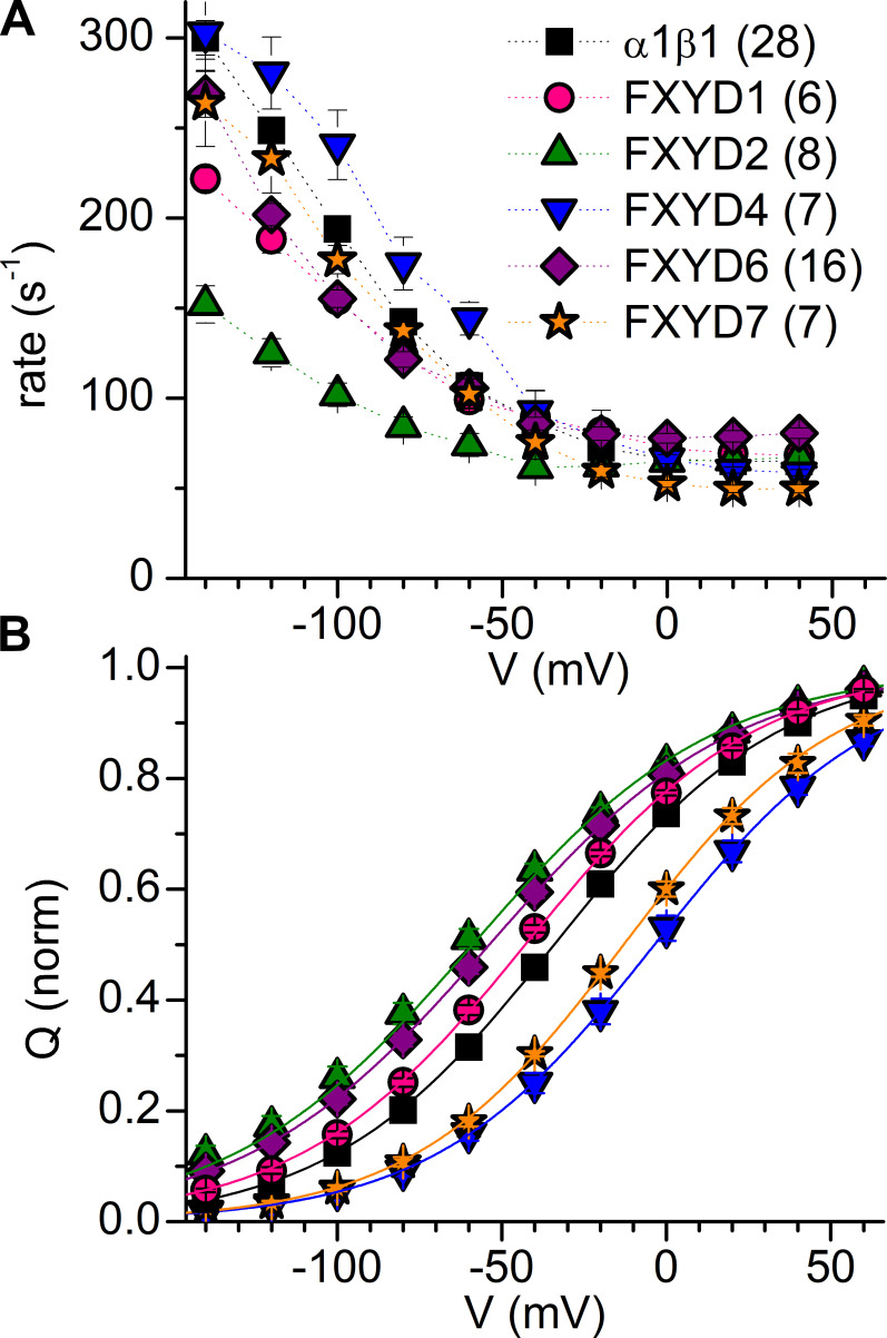 Figure 4. Effect of FXYDs on charge movement. (A) Mean transient charge-movement rate for α1β1 alone or coexpressed with FXYD proteins. The rates were calculated from monoexponential fits to the integral of transient currents. (B) Mean normalized Q-V curves for α1β1 alone or when coexpressed with FXYD isoforms. Error bars are SEM in both panels. See also Table 2 (note that the α1β1 and α1β1FXYD1 shown here are those that started at a holding potential of −50 mV). |