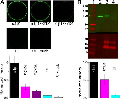 Figure 7. Reduced plasma membrane expression of Na/K pumps with FXYD1 and FXYD6. (A) Confocal image of representative oocytes following incubation in BODIPY FL-ouabain (1 µM). Note that preincubation of uninjected oocytes with unlabeled ouabain (UI+ouab) eliminates the signal observed in uninjected oocytes (UI). Fluorescence intensity was measured in two concentric circles (one including the plasma membrane signal) to subtract background fluorescence. The bar graph at the bottom summarizes results from two batches of oocytes (one batch for FXYD6) normalized to the fluorescence intensity measured in oocytes injected with α1β1 alone. (B) Representative Western blot of plasma membrane preparations from oocytes expressing α1β1 (lane 2), α1β1FXYD1 (lane 3), and FXYD1 alone (lane 4), 3 d after injection (14 oocytes in each condition). The top half was probed with the pan-α-antibody (a5, Developmental Studies Hybridoma Bank) and an anti-mouse secondary antibody (IRDye 800 CW goat anti-mouse; LI-COR). The bottom half was incubated with a polyclonal FXYD1 antibody (ab76597; Abcam) and an anti-rabbit secondary antibody (IRDye 680RD goat anti-rabbit; LI-COR). The bar graphs at the bottom summarize results from five membrane preparations from four oocyte batches, normalized to the intensity of α1β1 alone. Pump current activated by 4.5 mM K+, 145 mM Na+ in 28 α1β1 and 34 α1β1FXYD1 oocytes included in these membrane preparations were 219 ± 19 nA and 100 ± 10 nA (mean ± SEM), respectively. |