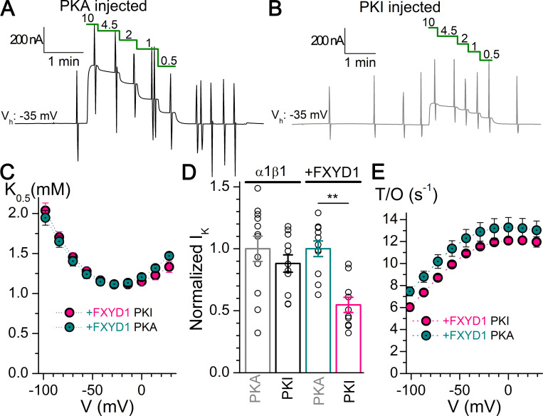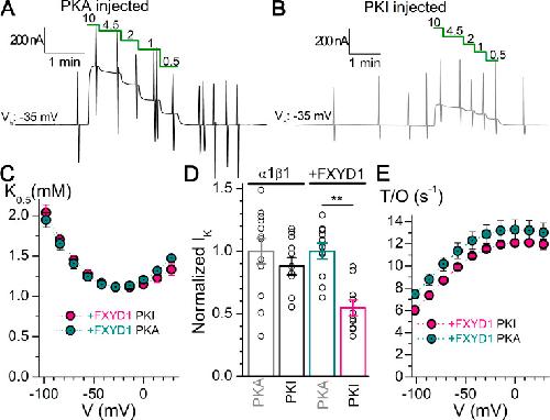 Figure 8. Effect of PKA on α1β1FXYD1 expression and kinetics. (A and B) Representative recordings of dose–response for K+o on oocytes expressing α1β1FXYD after injection with PKA (A) or PKI (B). (C) Mean K0.5-V from oocytes expressing α1β1FXYD1 injected with PKA (n = 20) or PKI (n = 19). (D) Mean normalized current induced by 10 mM K+o in two batches of oocytes expressing α1β1 or α1β1FXYD1 after injection with PKA or PKI, measured on the same day. Error bars are SEM. Asterisks indicate significantly different at P < 0.001. (E) Turnover rate in 4.5 mM K+o for oocytes expressing α1β1FXYD1 injected with PKA (n = 10) or PKI (n = 10). Error bars are SEM. |