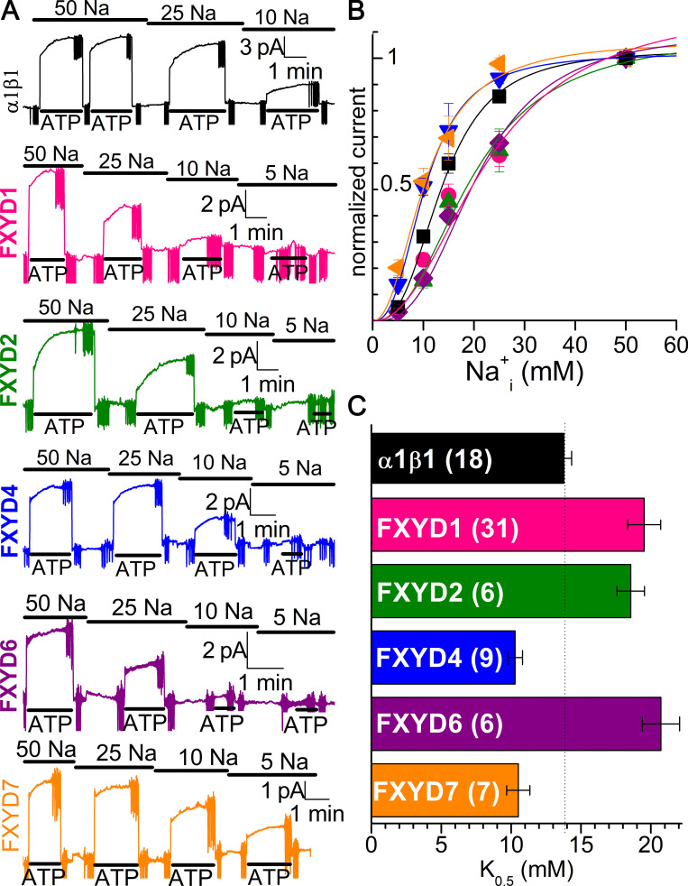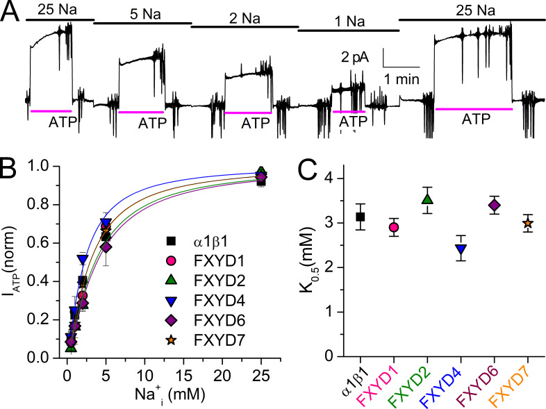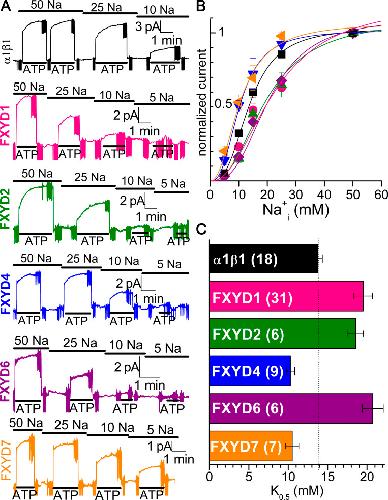 Figure 10. FXYD effects on Na/K pump interaction with Na+i in the presence of K+i. (A) Patches from oocytes expressing each FXYD protein were held at 0 mV with extracellular solution containing 5 mM K+o in NMDG. The bars on top indicate [Na+]i (in mM), and the bars under the traces indicate application of MgATP (4 mM) to activate outward Na/K pump current. Vertical deflections correspond to application of 25-ms-long voltage pulses. Note biphasic activation by ATP. (B) Mean ATP-induced current as a function of [Na+]i, normalized to the value at 50 mM Na+i. Line plots are Hill equations with the parameters in Table 3. (C) K0.5,Na+ for each FXYD, from the number of experiments in parentheses. Error bars are SEM. |