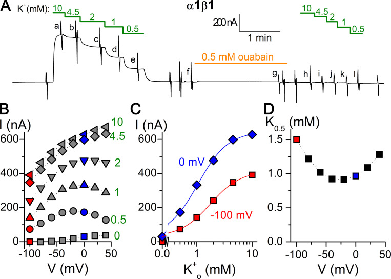 Figure 2. Recording and analysis of an experiment to determine the K0.5 for K+o. (A) Current at â50 mV of a Na+-loaded oocyte overexpressing the α1β1 pump, bathed in Na+o solution. Substituting Na+o with K+o stimulated outward current in a [K+]-dependent manner. Application of 0.5 mM ouabain for 2 min blocked currents in subsequent K+ applications. Vertical deflections along the recording indicate pulses to voltages between â100 and +40 mV. Lowercase letters indicate currents used to obtain ouabain-sensitive currents in B. (B) I-V plot of ouabain-sensitive current (current before ouabain application â current after ouabain application in the same condition) measured during the last 5 ms of 100-ms-long voltage pulses. (C) [K+o] dependence of ouabain-sensitive current at â100 and 0 mV fitted with Hill equations (line plots). (D) Voltage dependence of K0.5 for K+o. |