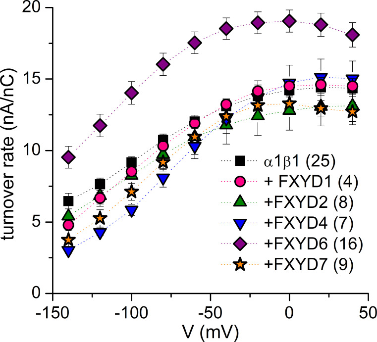 Figure 5. Effect of FXYD isoforms on turnover rate. Mean turnover rate at 4.5 mM K+o as a function of voltage. Error bars are SEM. Data from Warner amplifier are shown. Values at 0 mV are (± SD in s−1): 14.9 ± 3.0 (n = 47, data from Warner and Dagan amplifiers) for α1β1, 12.9 ± 3.0* for α1β1FXYD1 (n = 20, data from Warner and Dagan amplifiers), 12.8 ± 3.9 for α1β1FXYD2, 14.7 ± 3.3 for α1β1FXYD4, 19.1 ± 3.1 for α1β1FXYD6**, and 13.3 ± 1.7 for α1β1FXYD7. Note that there are more oocytes where we measured pump current at 4.5 mM K+o and charge movement than full dose–response curves and charge movement. Significantly different with respect to α1β1 alone by t test: *, P < 0.05; **, P < 0.001. |