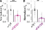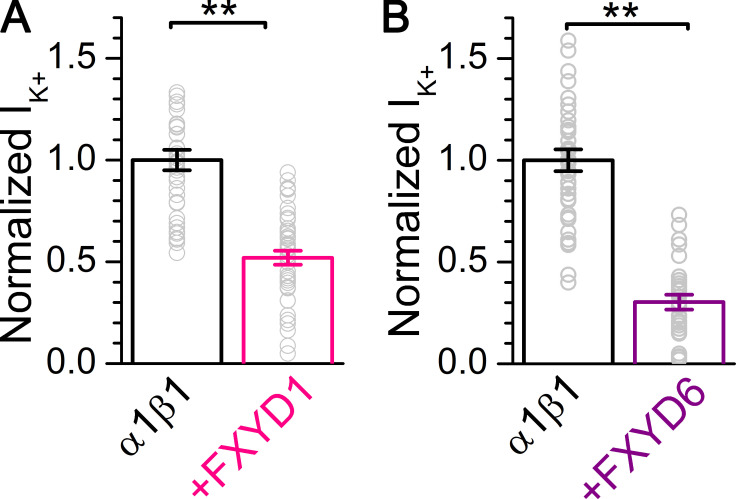 Figure 6. FXYD1 and FXYD6 reduce pump current. (A and B) Mean normalized K+o-induced currents from oocytes expressing α1β1 (n = 40) or α1β1FXYD1 (n = 45; A) and for α1β1 (n = 38) or α1β1FXYD6 (n = 29; B). Each group was normalized to the mean outward current from α1β1 oocytes measured the same day or on subsequent days in seven batches of oocytes in each condition. Error bars are SEM. Normalized data points from individual oocytes are shown as open circles. Asterisks indicate significantly different with respect to α1β1 alone by t test, **, P < 0.001. |