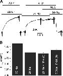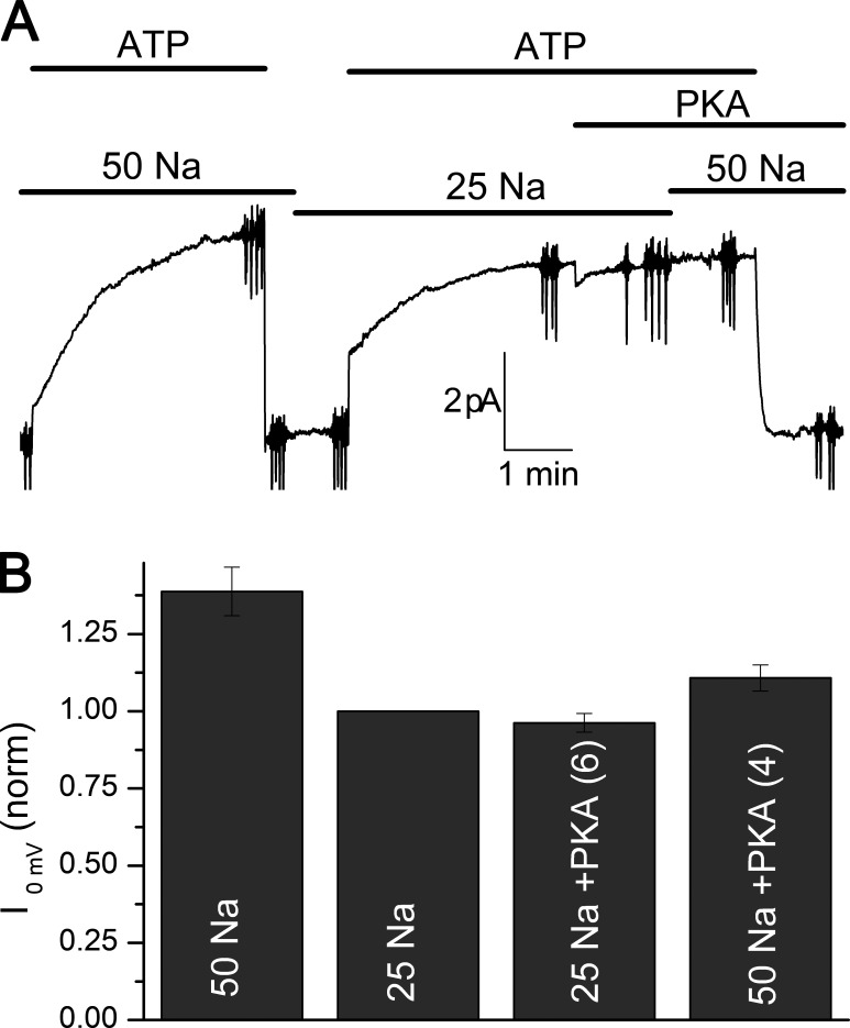 Figure 11. PKA failed to increase Na/K pump current at 25 mM Na+i. (A) Na/K pump current was activated by application of ATP in 50 mM and then 25 mM Na+i. After the current reached steady state, PKA was applied at 25 mM Na+i without effect during 2 min. Subsequent application of 50 mM Na+i minimally increased the current. (B) Bar graph summarizing results from six patches (four at 50 mM Na+i) in which similar maneuvers were performed. |